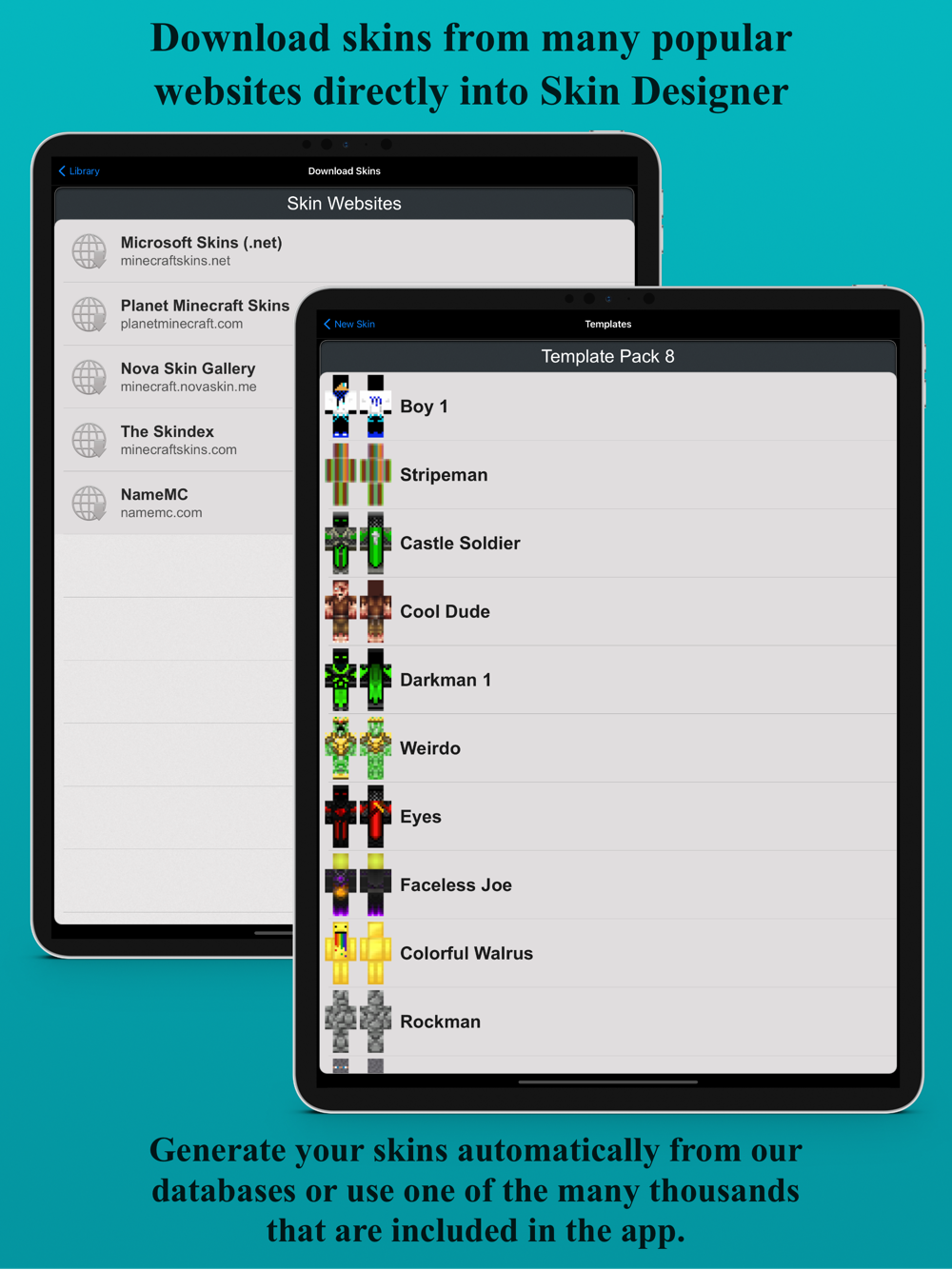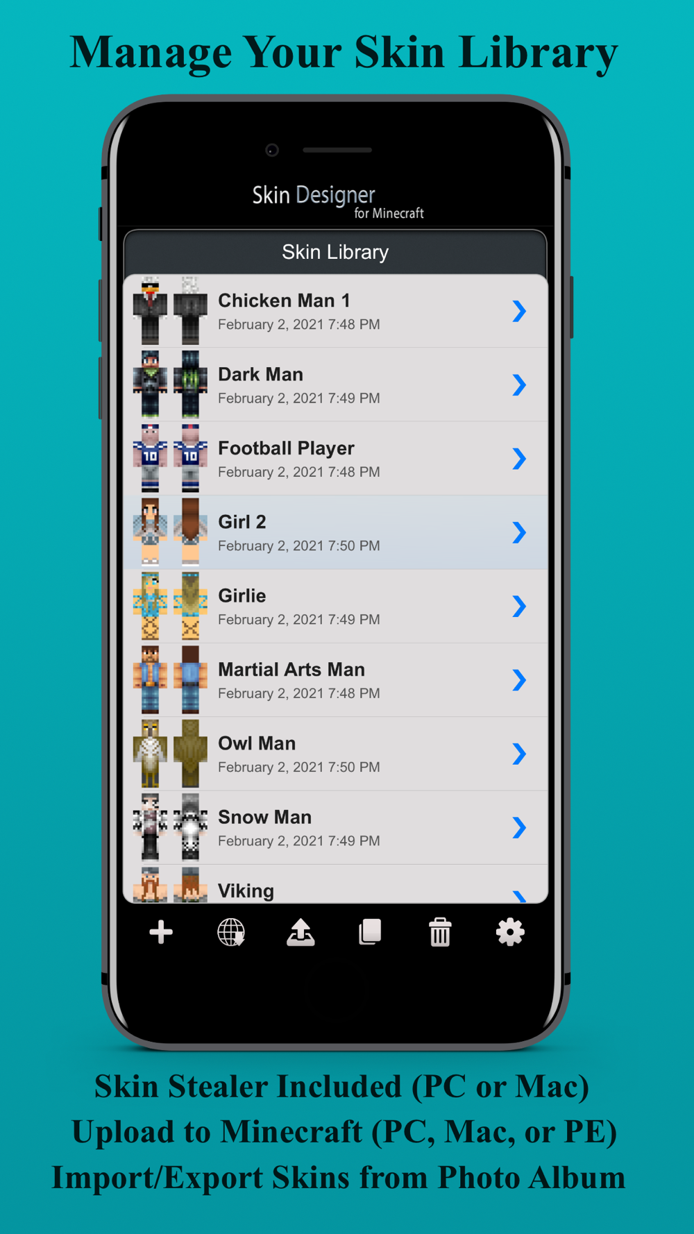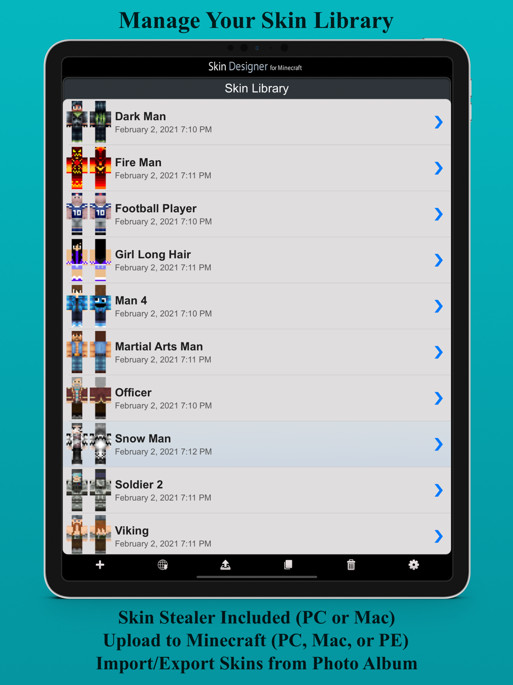 Skin Designer is an app that lets you design and manage your own player skins for Minecraft. Using Skin Designer, you simply create your skin and use the upload button to upload your skin to minecraft.net, export it to your photo album for use in Minecraft PE, email it to others, or show it off on your Facebook or Twitter account.