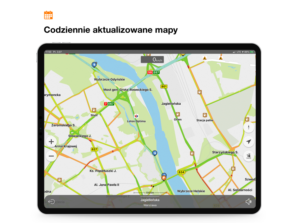 - codziennie aktualizowane mapy, uwzględniające nowe odcinki dróg, zmiany organizacji ruchu oraz trwające remonty,