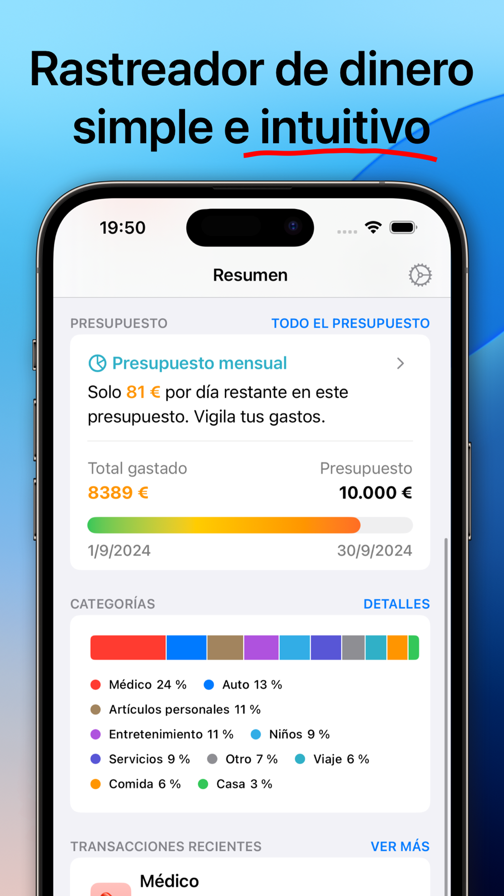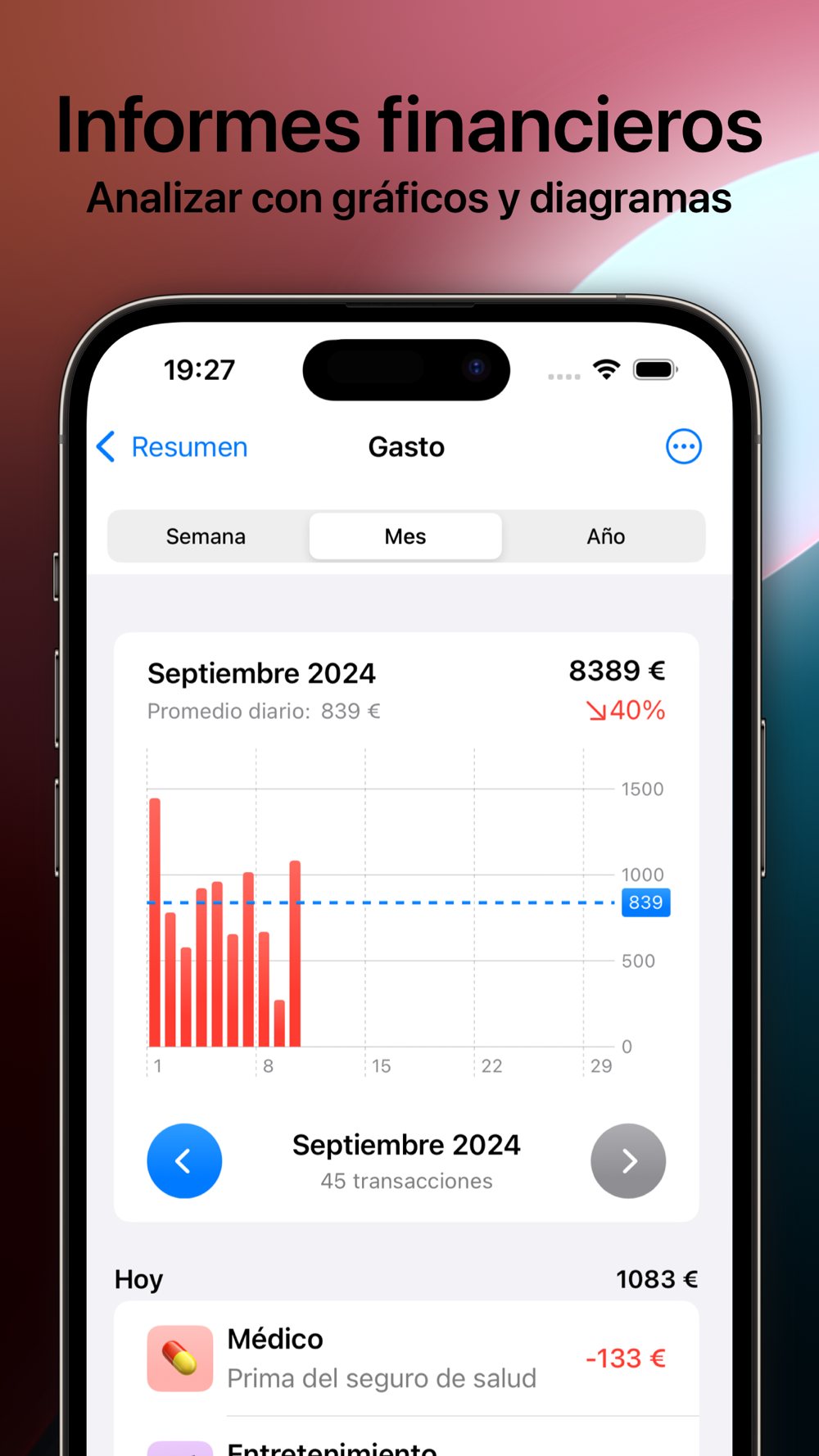• Informes detallados: Comprende tus hábitos de gasto con informes financieros claros y científicos.