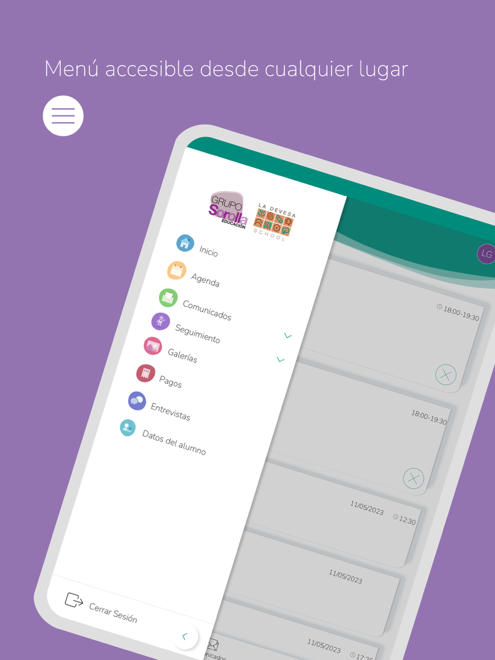 La app para familias de La Devesa School Elche es una herramienta muy intuitiva para la comunicación con el centro educativo, gracias a su diseño, muy visual y centrado en la usabilidad. Desde su pantalla principal tendrás acceso a toda la información publicada por el centro, y su sencillo menú te permite acceder rápidamente a las funcionalidades más utilizadas.