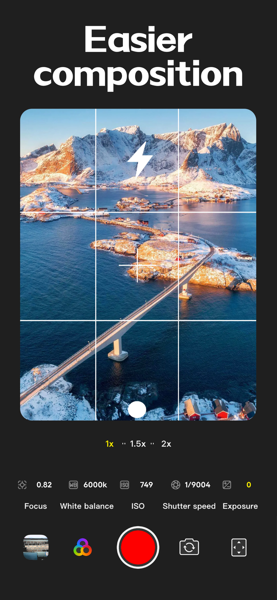 - Full-screen clean mode for immersive shooting