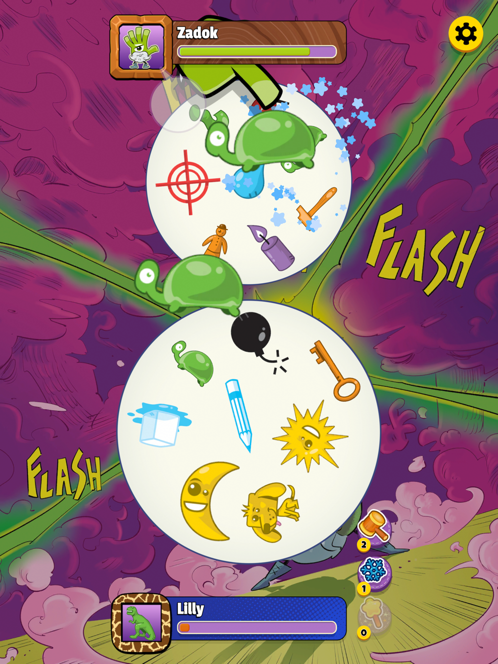 SPOT IT! GO! introduces exciting power-ups to the mix! Like a freeze that stops your opponent for vital thinking seconds, a hammer to knock out a wrong symbol or a magic wand to match the two symbols for you.