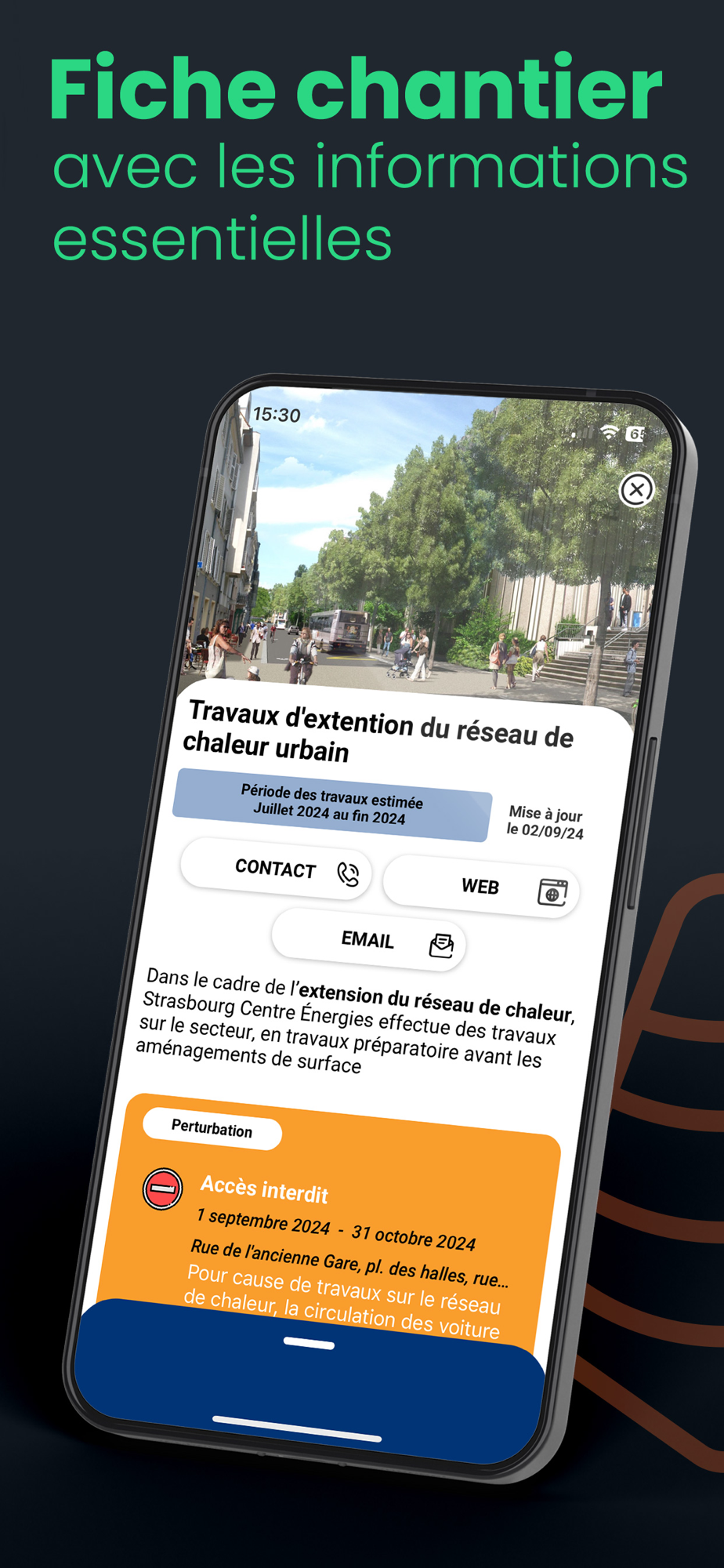 L'application Chantiers Eurométropole permet aux usagers d'être informés sur les travaux impactant réalisés sur le territoire de l'Eurométropole de Strasbourg. Les informations sont mises à disposition par les fiches chantiers disponibles dans l'application. La création d'un compte permet à l'utilisateur d'être informé des évolutions du chantier, de ses impacts et de ses bénéfices. Cela lui permettra également de recevoir des informations ciblées sur les chantiers qui l'intéressent par le biais de notifications.
