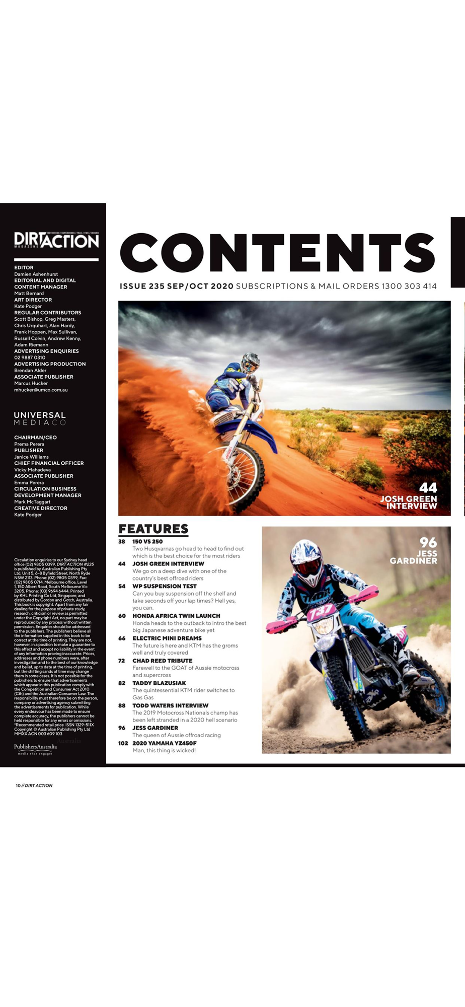 Each month, DIRT ACTION delivers an action-packed issue including all the latest dirtbike news from around the globe. Covering motocross, supercross, trail, enduro and FMX; each issue includes test rides on the latest dirtbikes, heaps of technical know-how, in-depth articles and riding tips and tricks.