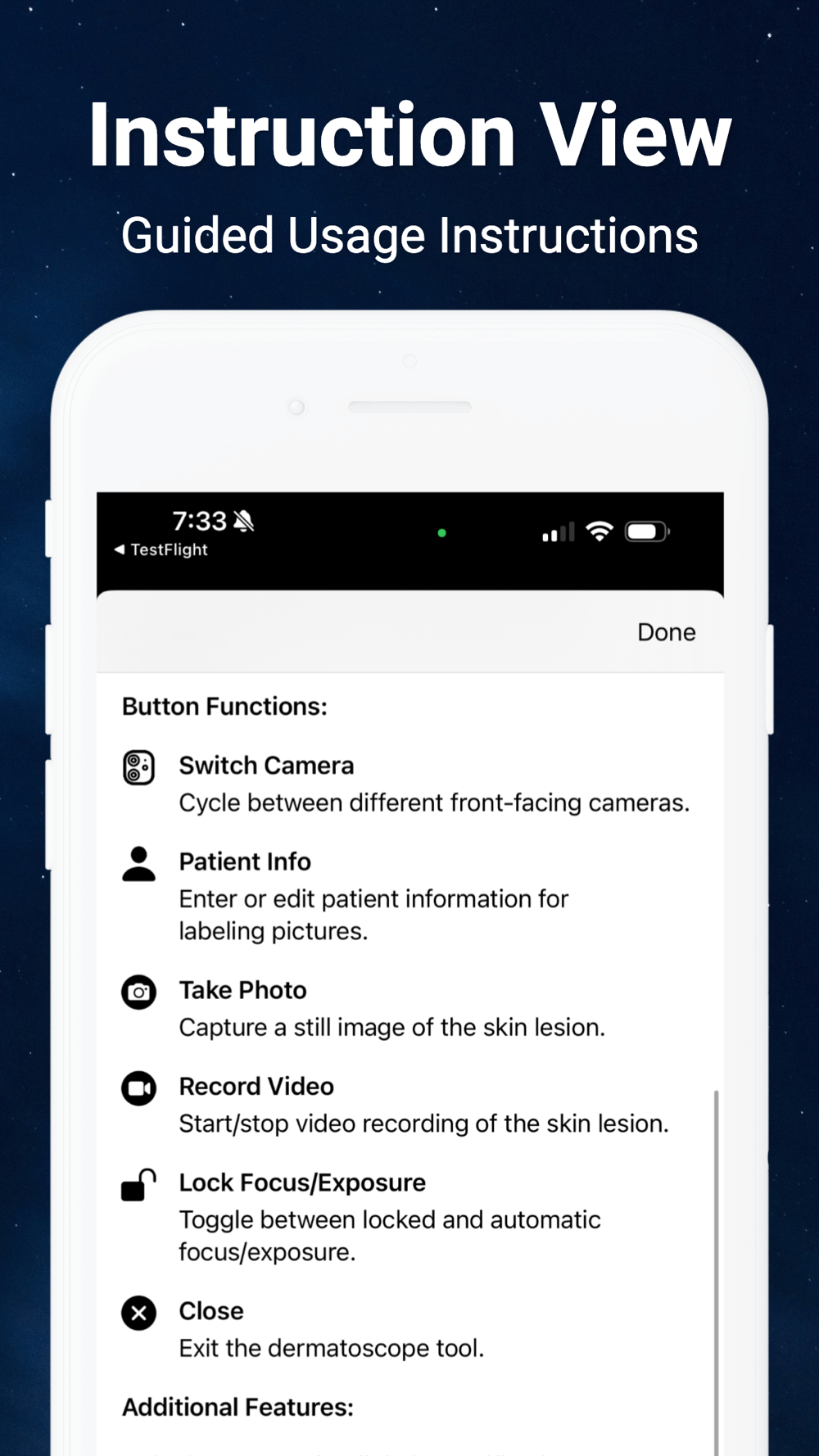 Camera Integration: Leverage your iPhone’s camera to capture clear images and videos of skin conditions while preventing automatic lens switching and flash activation.