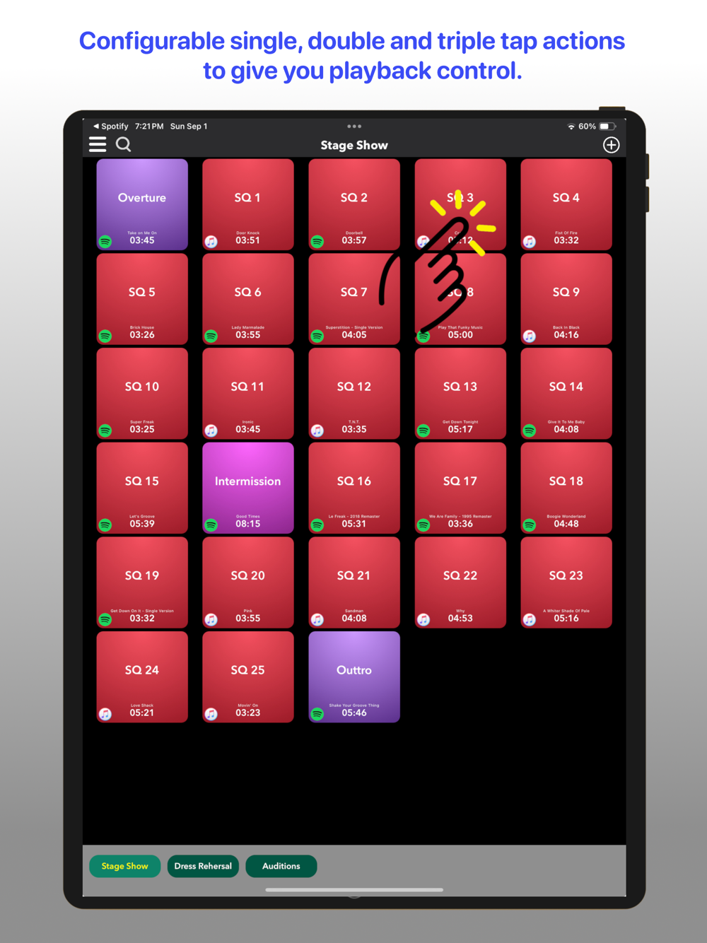 SQ Theatre Sound Cues gives you the simple and intuitive tools you need to strike right mood for the play with music and sounds. Take command of the music for Overtures, Intermission, Outros and any sound effects the show calls for - you're the Sound Engineer.