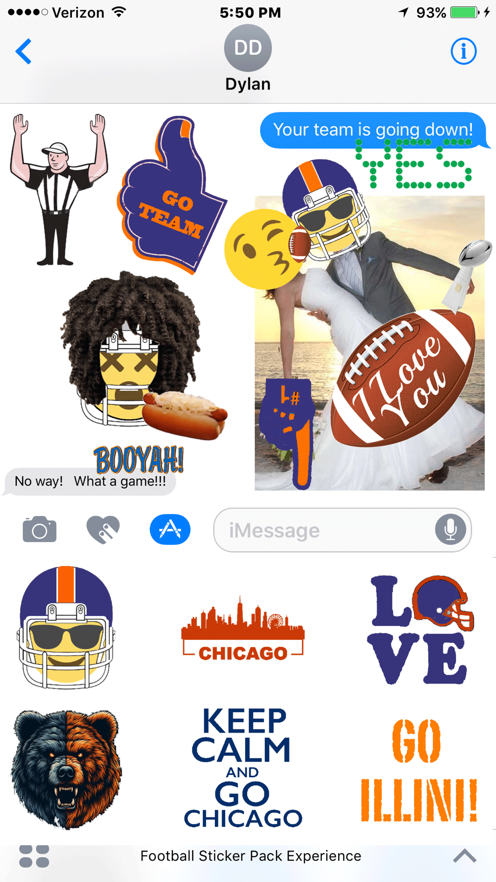 Your Chicago football experience sticker pack for all ages and those who are football fanatics. Enjoy this CHI themed sticker pack with emojis with helmets, fan slogans, hats and gear, football sayings, sticker accessories, etc.