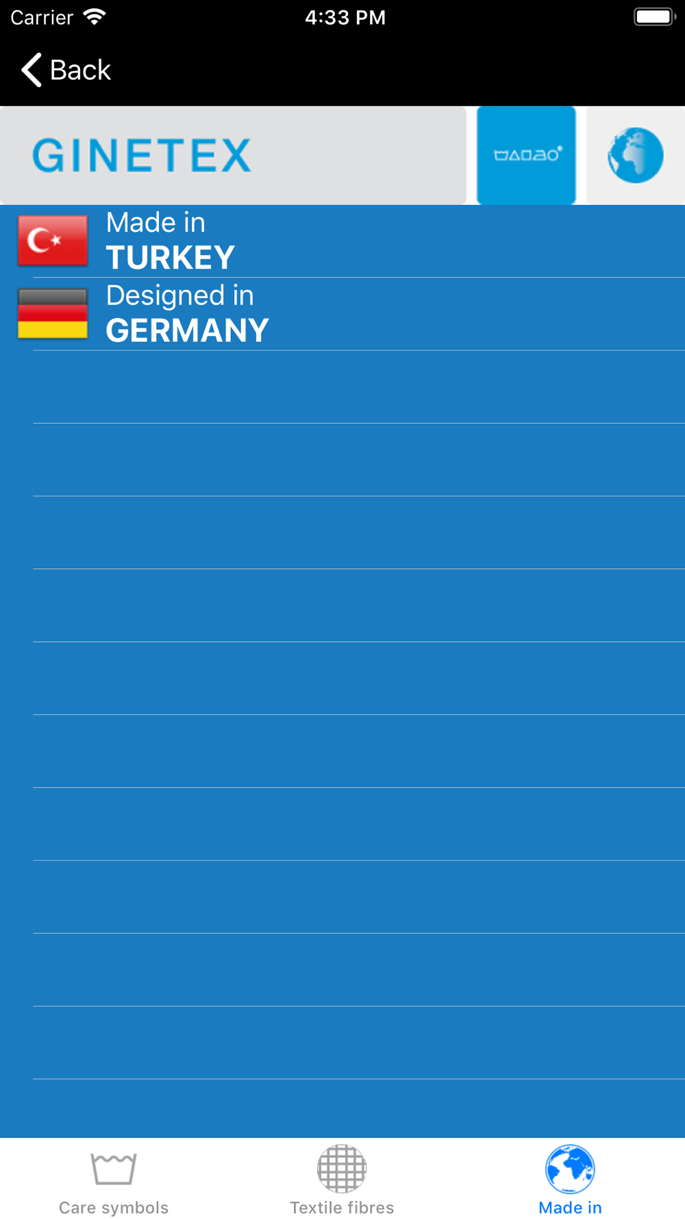 Additionally textile fibre and Made in information is displayed. The app's user interface as well as the explanation texts appear in the language the end user has set in his smart phone. Currently "German", "English", "French" and "Italian" are supported. English is used by default.