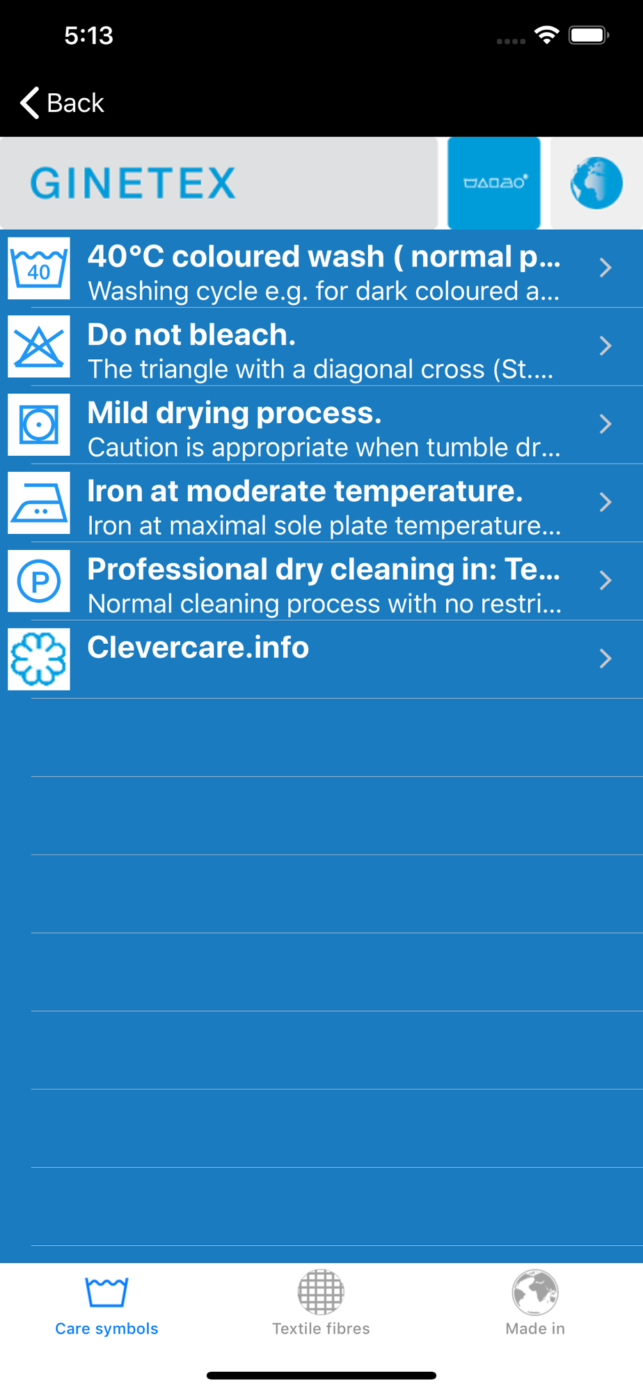 The app offers the ability to display and explain the care symbols according to ISO 3758. The symbols can be found on the care labels of textile products.