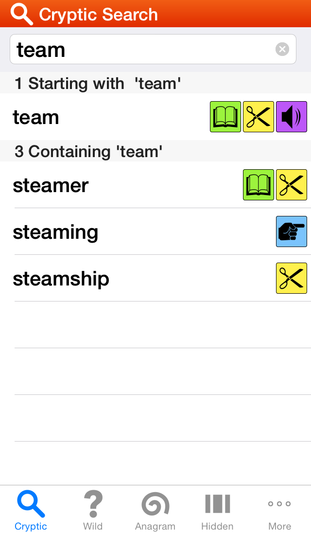CrypticGuide also includes a powerful wildcard search, to help with filling in obstinate entries, a hidden word finder, and an anagram solver. The wildcard, hidden word, and anagram searches can use either a full word list, or a more limited list for word games (omitting proper nouns and phrases). The app accesses the system dictionary, so you can get definitions. There is a detailled user guide included in-app.