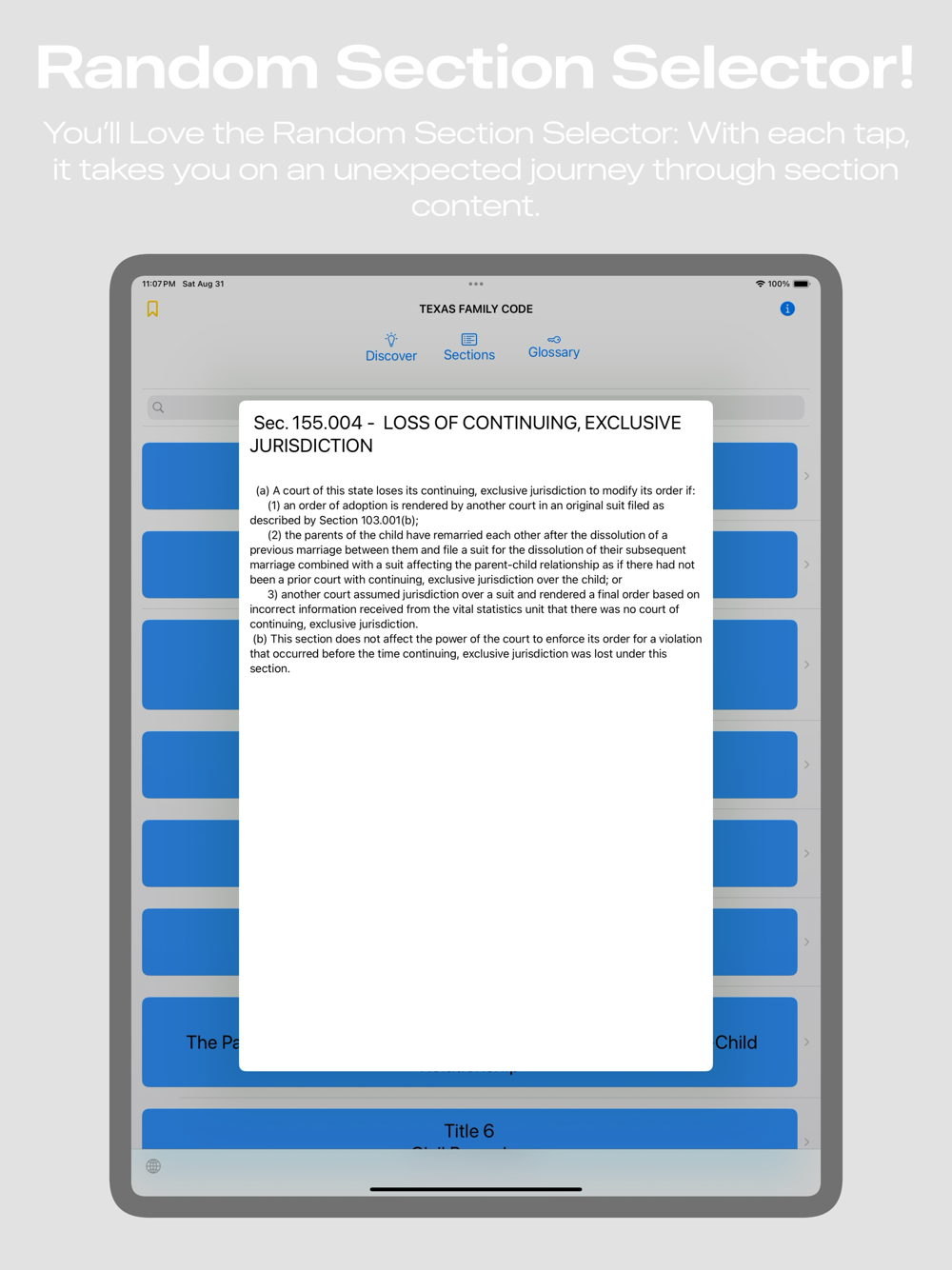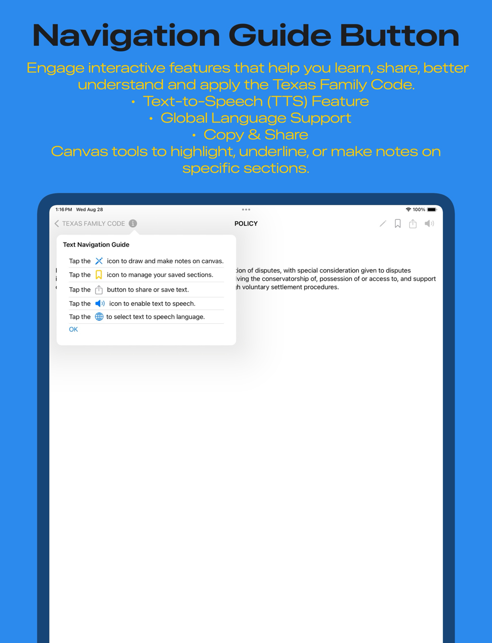 • Educational and Inclusive: Perfect for language learners, international users, or those with visual impairments, the TTS feature ensures everyone can access and understand the Texas Family Code, regardless of their native language or reading ability.