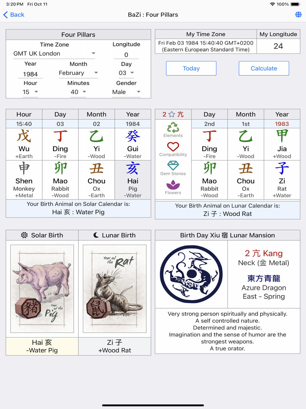 Ba Zi - Four Pillars Chart (Solar and Lunar Calendar).