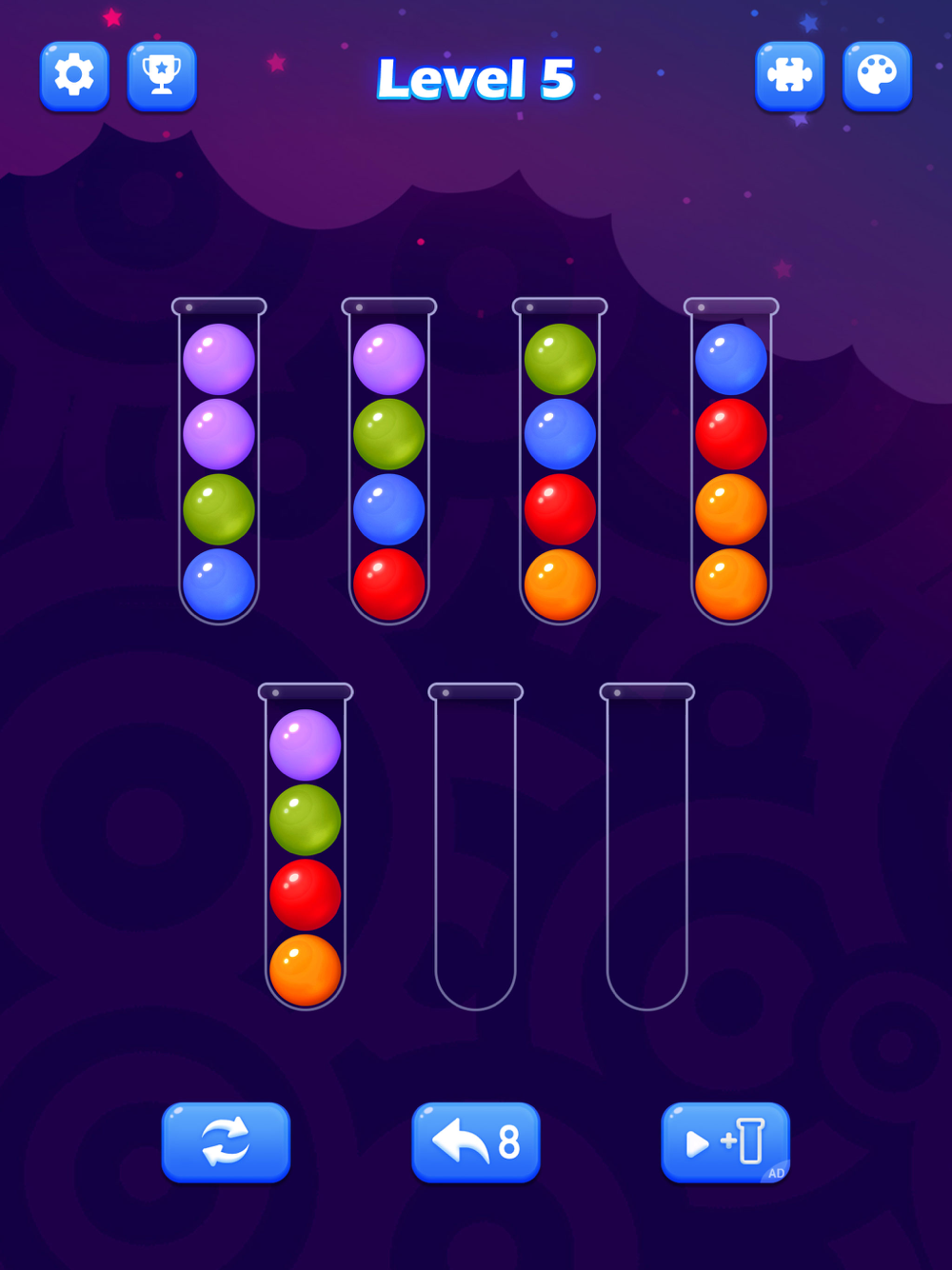 This ball sort puzzle game is suitable for all ages of puzzle game players. For kids, the sort color ball game is good for developing their IQ, and playing bubble sort with your children will also build a bond with them. For Seniors, playing ball sorting can keep your mind sharp and help prevent mental decline. For young and middle-aged people, playing sort ball puzzle is a good way to release stress from work or studies.