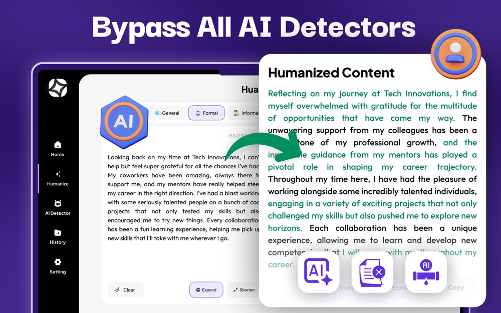Testamos nossa ferramenta em programas de detecção de IA, incluindo Turnitin, Copyleaks, ZeroGPT, HIX AI, Undetectable AI e muitos outros. Usuários que desejam ignorar essas ferramentas podem experimentar nosso aplicativo humanizador gratuito.