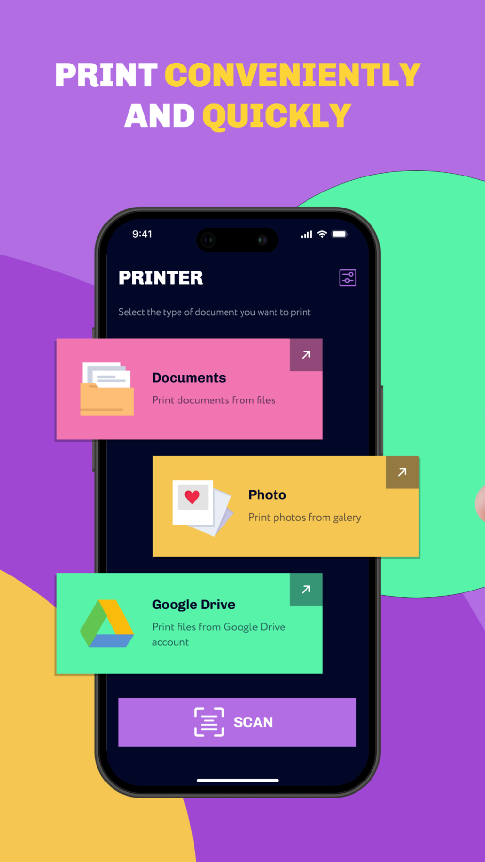 The App makes printing documents and photos effortless. Scan a new document, select your printer, and print within seconds. It’s compatible with over 5000 printers!