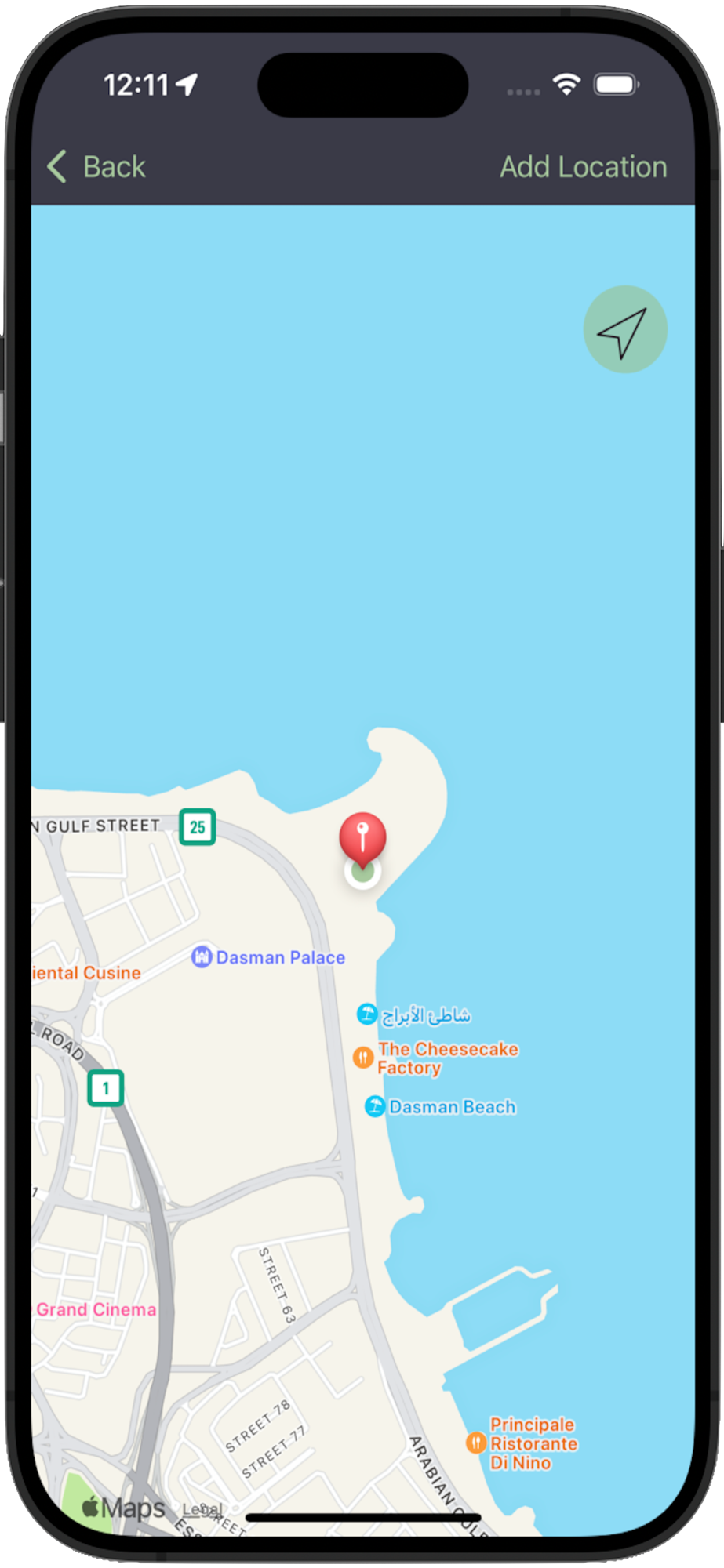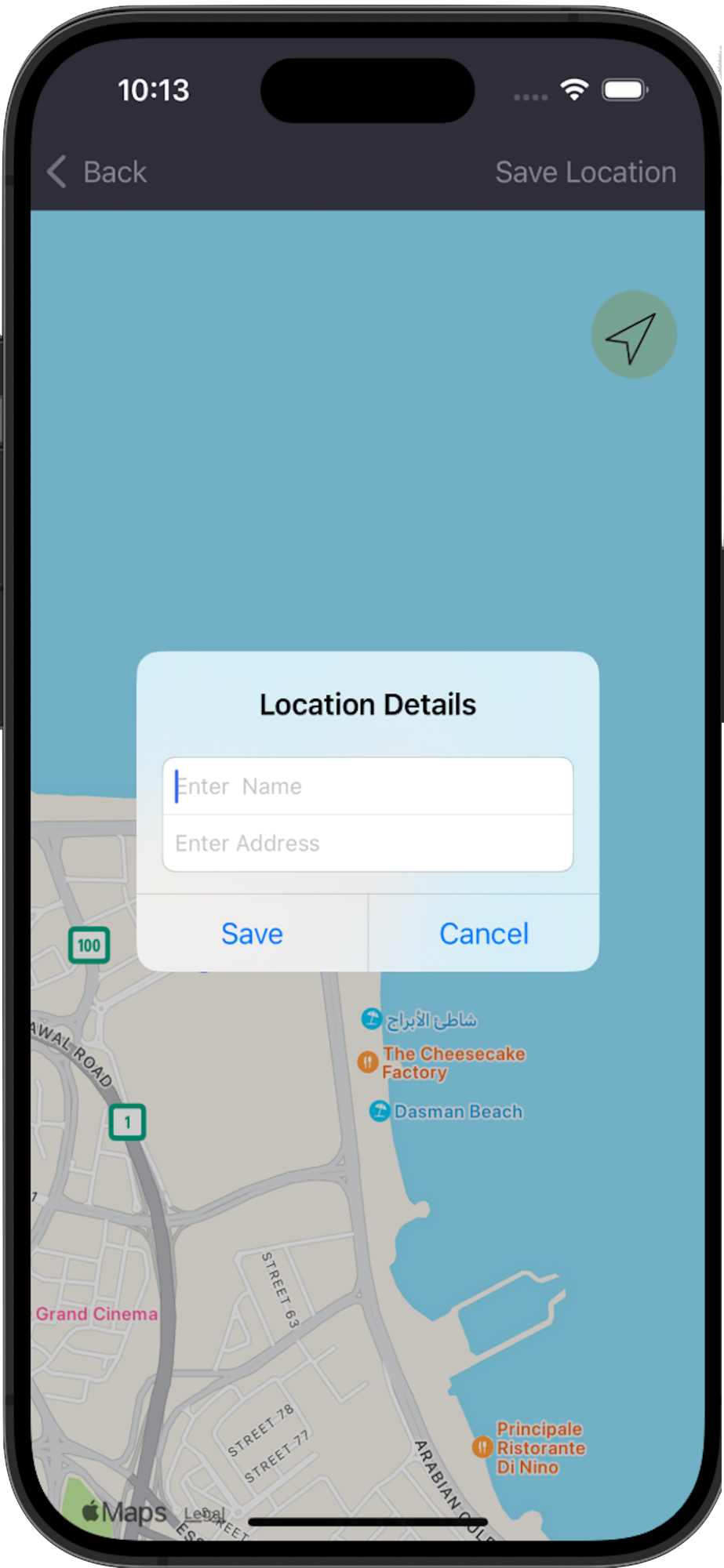 2. On next screen clicking on on 'Save Location' will prompt to ask location name and address.