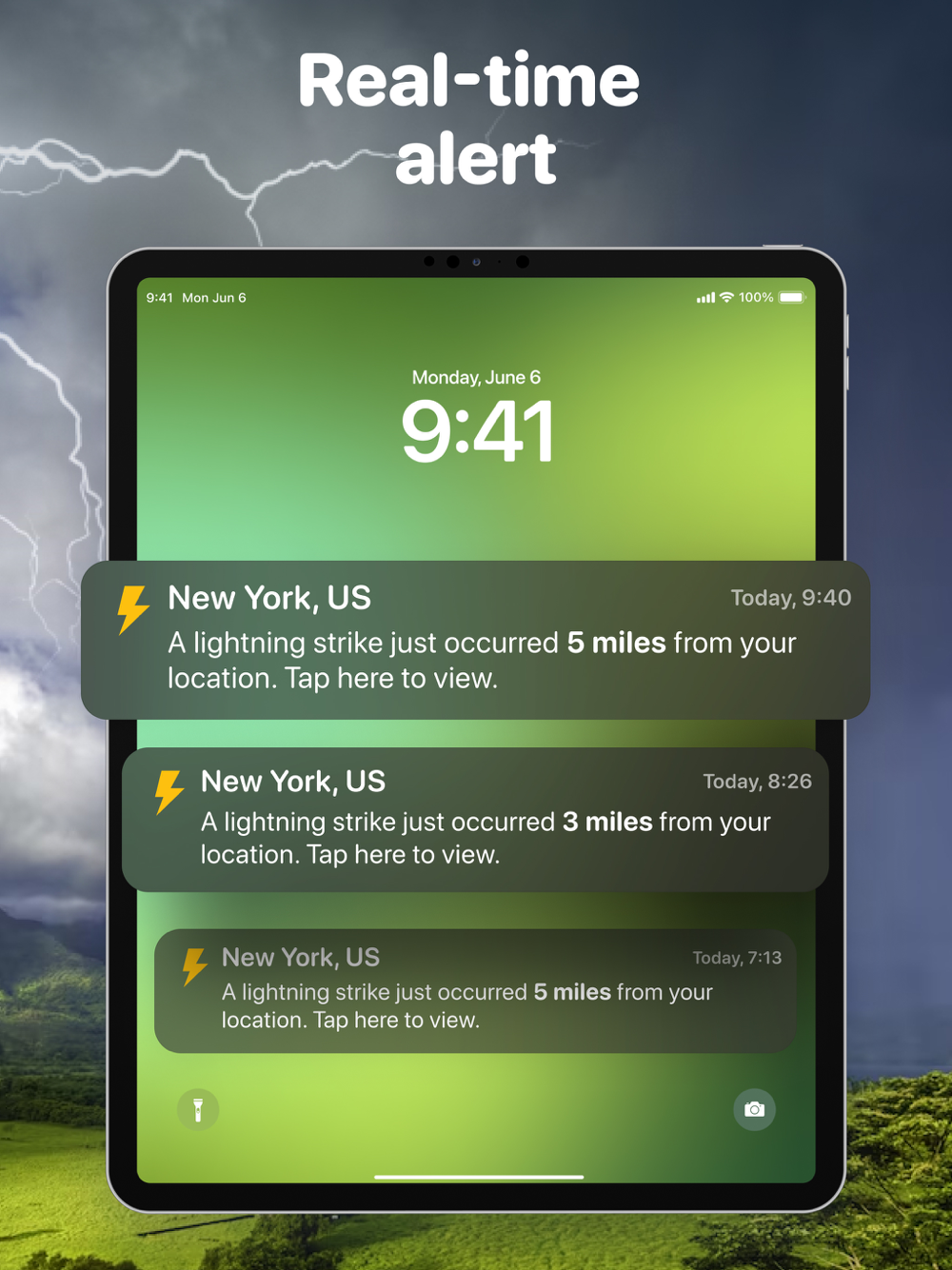 - Receive instant lightning alerts for nearby strikes, severe weather conditions