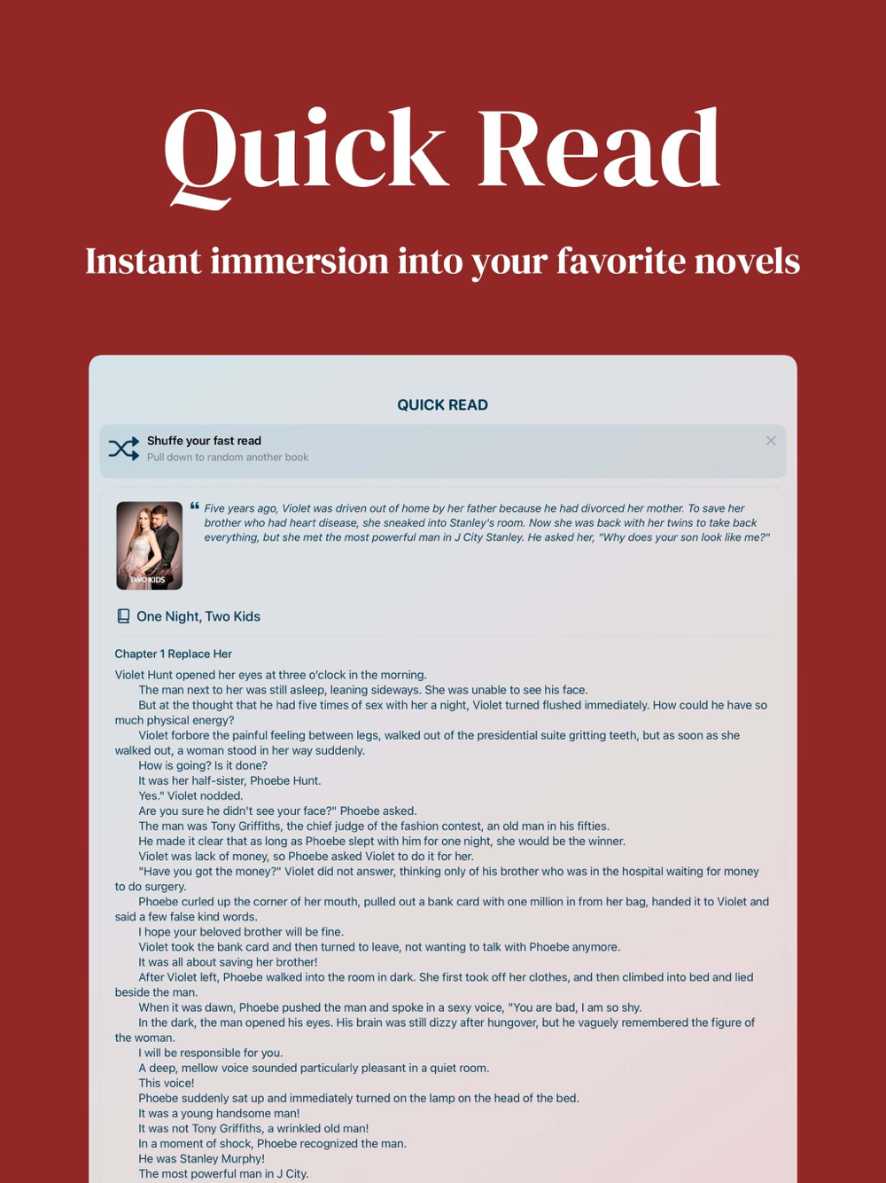 Our standout feature, "Quick Read," lets you dive straight into your favorite story as soon as you open the app. No complicated menus, just instant reading enjoyment. We’ve also included a bestseller chart that highlights the most popular novels, so you’re always in the know about the hottest reads.