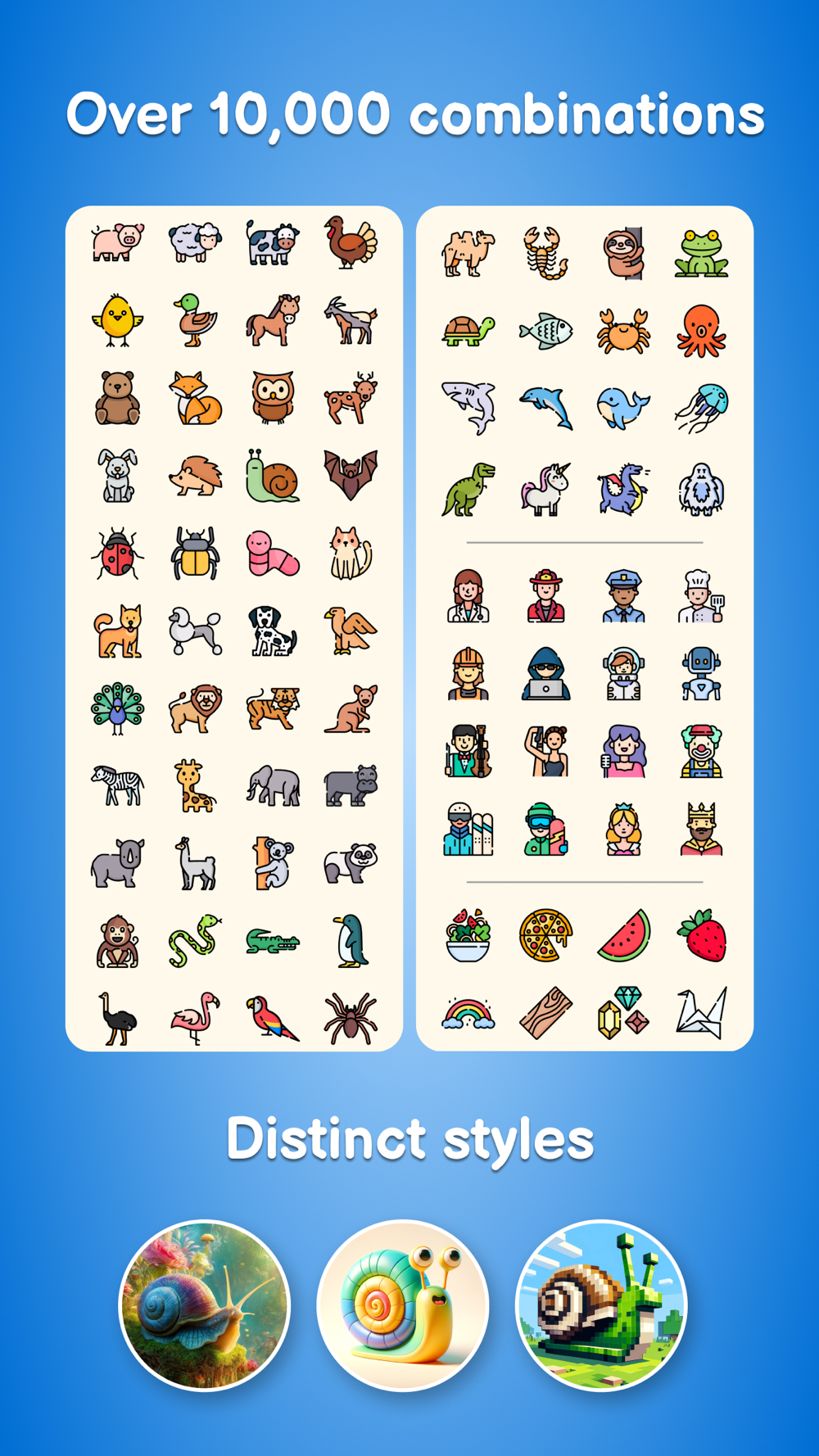 Choose from magical realism, cartoon, or block-like art styles, hatch surprise critters, and expand your collection. Share your hilarious combinations with your buddies!