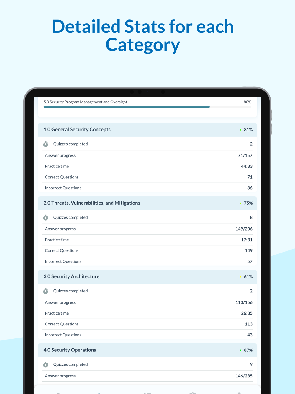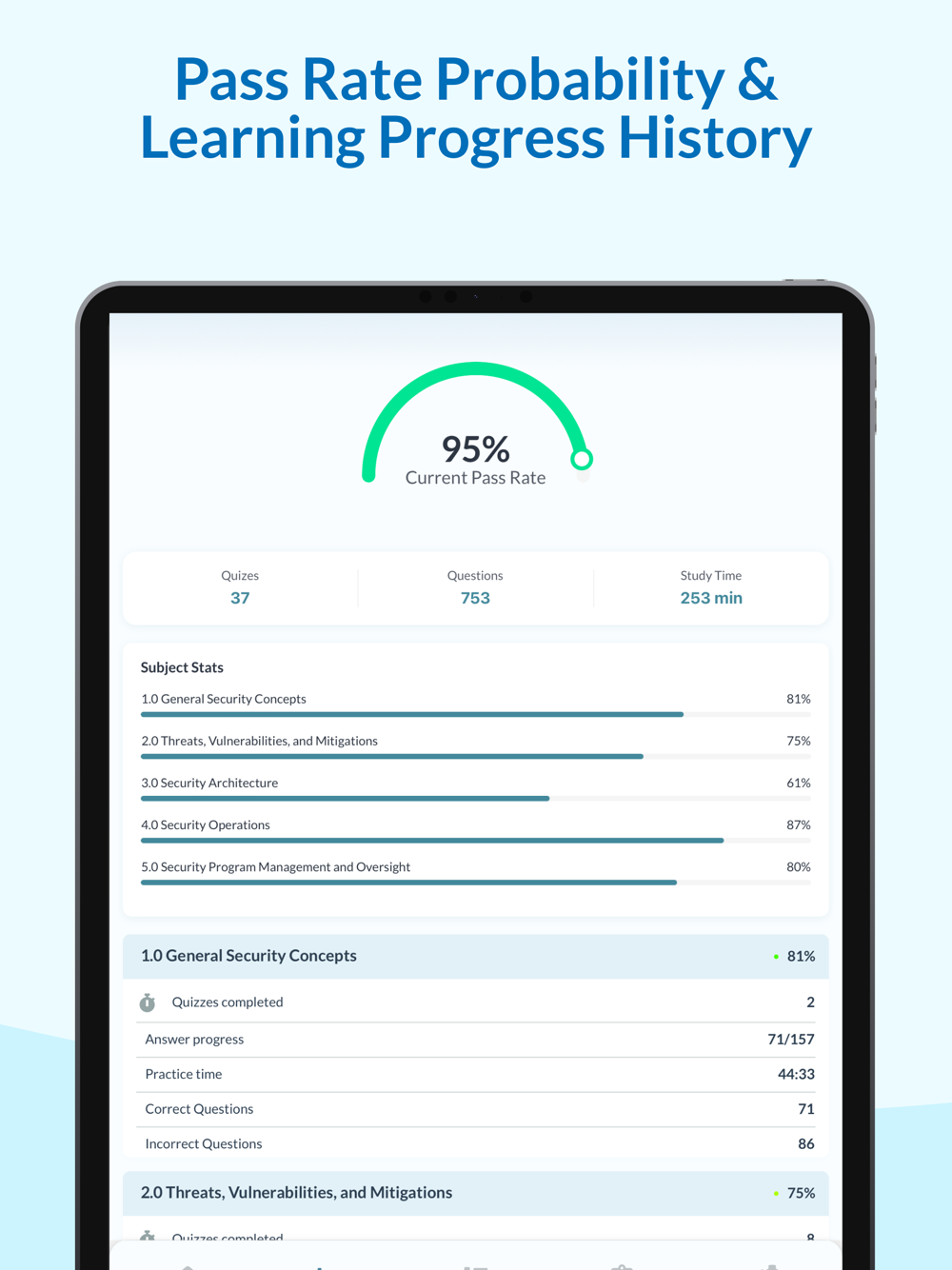 Progress tracking with passing scores and quiz statistics