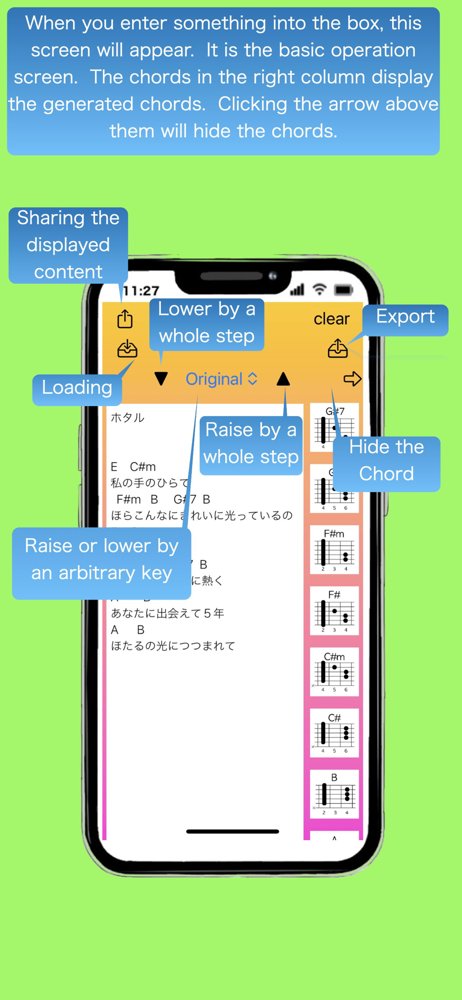 When you input lyrics and chords into the display box, the app will recognize only the chords and allow you to change them up or down without altering the lyrics. Additionally, the chords that appear in the lyrics, along with their basic finger positions, are displayed in a list on the right side of the screen. The converted chords can also be shared.