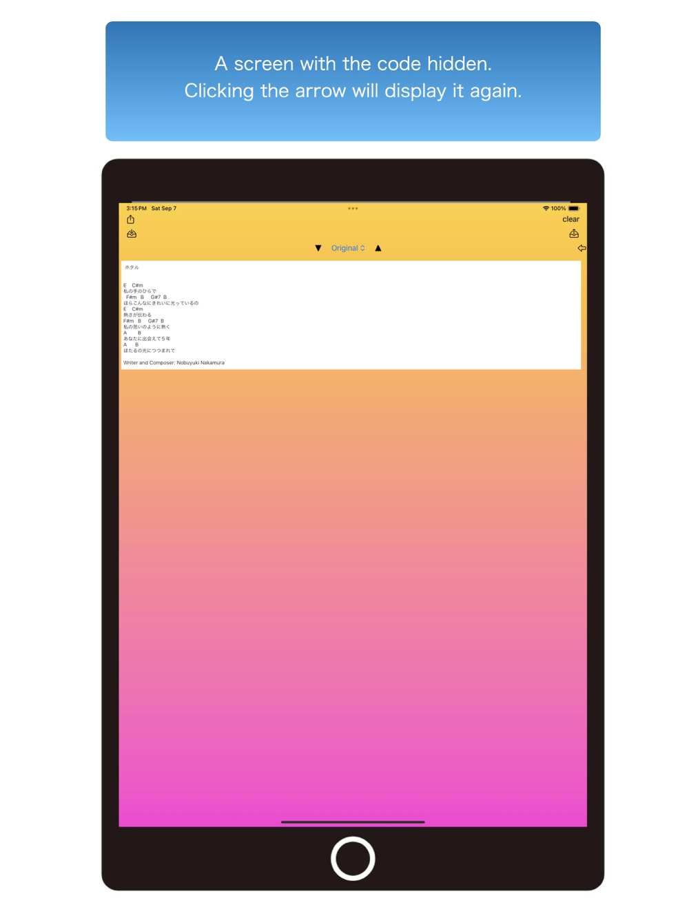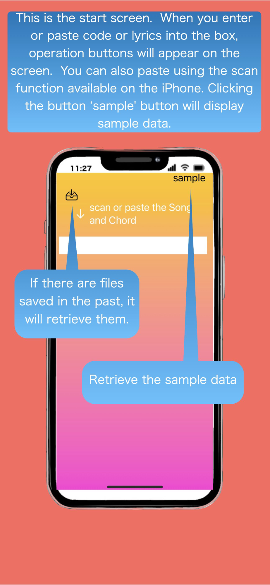 In the input field, you can either type using the keyboard, copy and paste from other files, or use the text scan feature that comes standard on iPhones. However, when using text scan, spaces between chords may not be scanned correctly, so you will need to manually add spaces as necessary after scanning. While text scanning is possible, due to the space issue and its limitation in scanning large amounts at once, copying and pasting from other lyrics or chord sources is recommended.