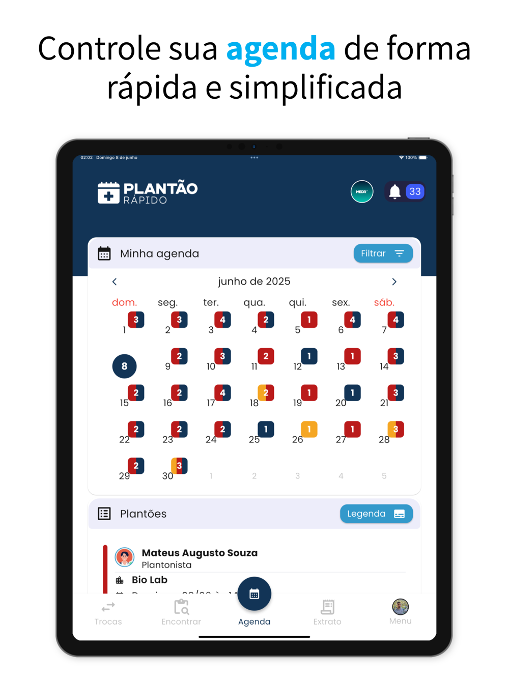 - Sua agenda, no controle: Organize e acompanhe seus plantões de forma fácil e eficiente.