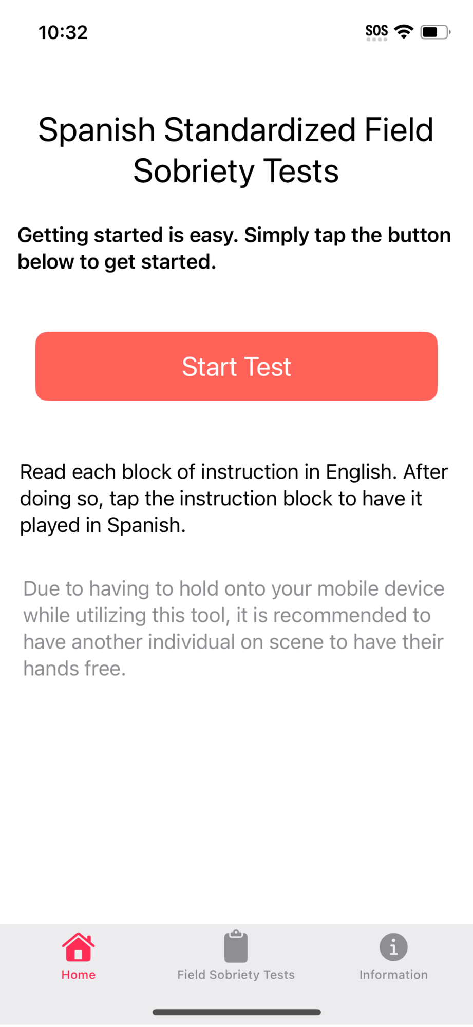Spanish SFST is a practical, reliable tool built to help law enforcement officers administer Standardized Field Sobriety Tests (SFST) in Spanish. By delivering clear, accurate translations, the app bridges language barriers, supports effective communication, and ensures fair, consistent testing in diverse communities.