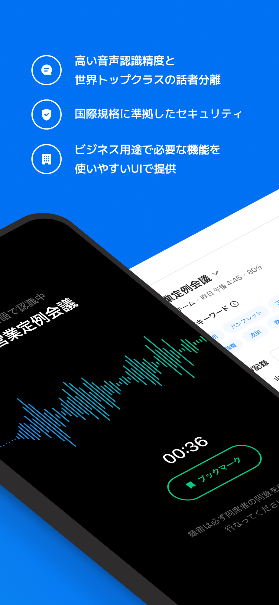 本サービスによる録音は必ず同席者の同意を得てから行なってください。なお、著作権等の他者権利の侵害、または名誉毀損や反社会的な内容等は、サービス利用停止の対象となります。