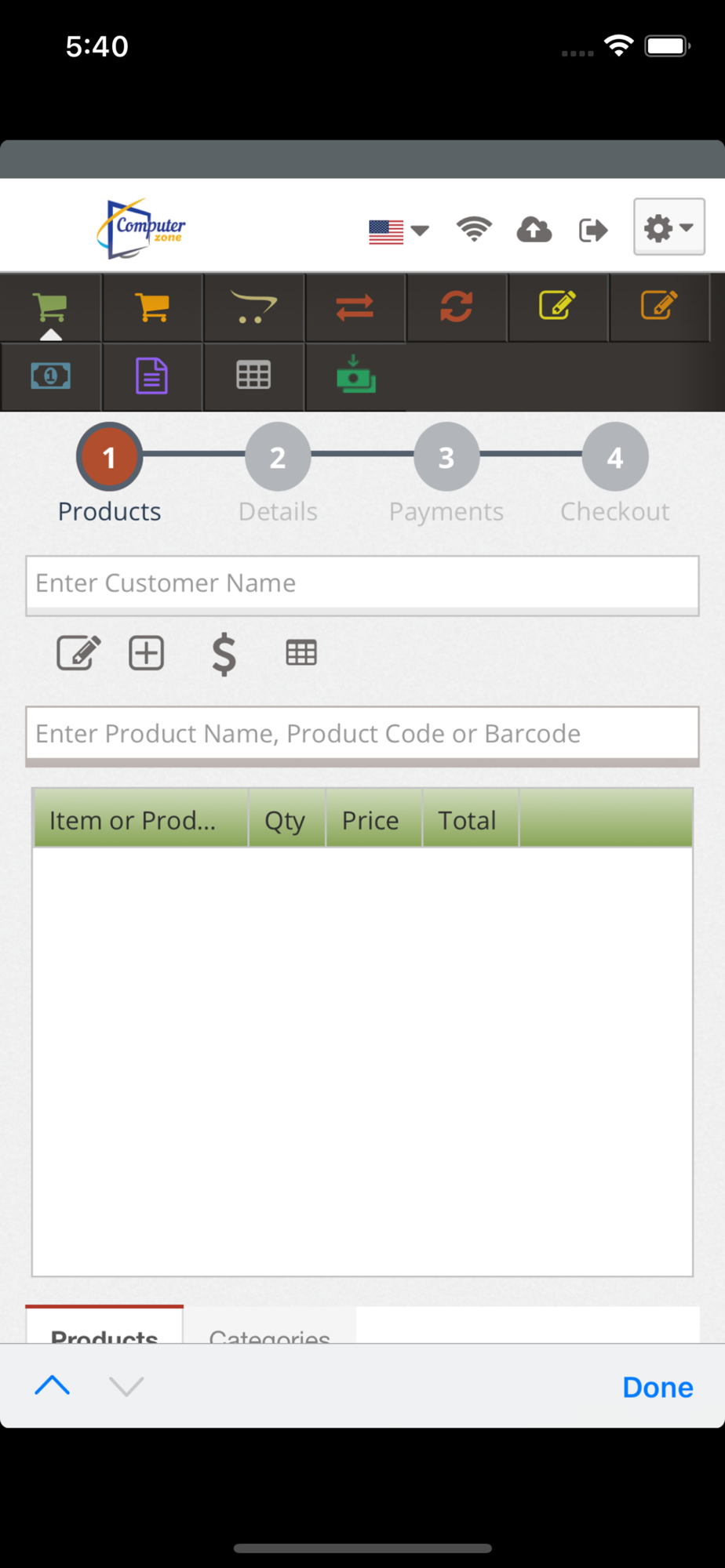 + Add items to each order using Quick Access buttons, Barcode Scanning or entering Product Name or Product Code.