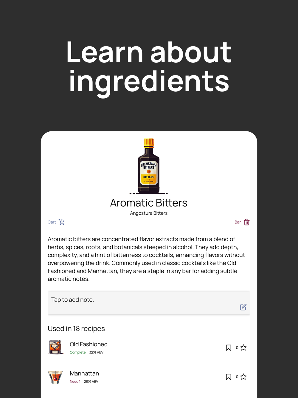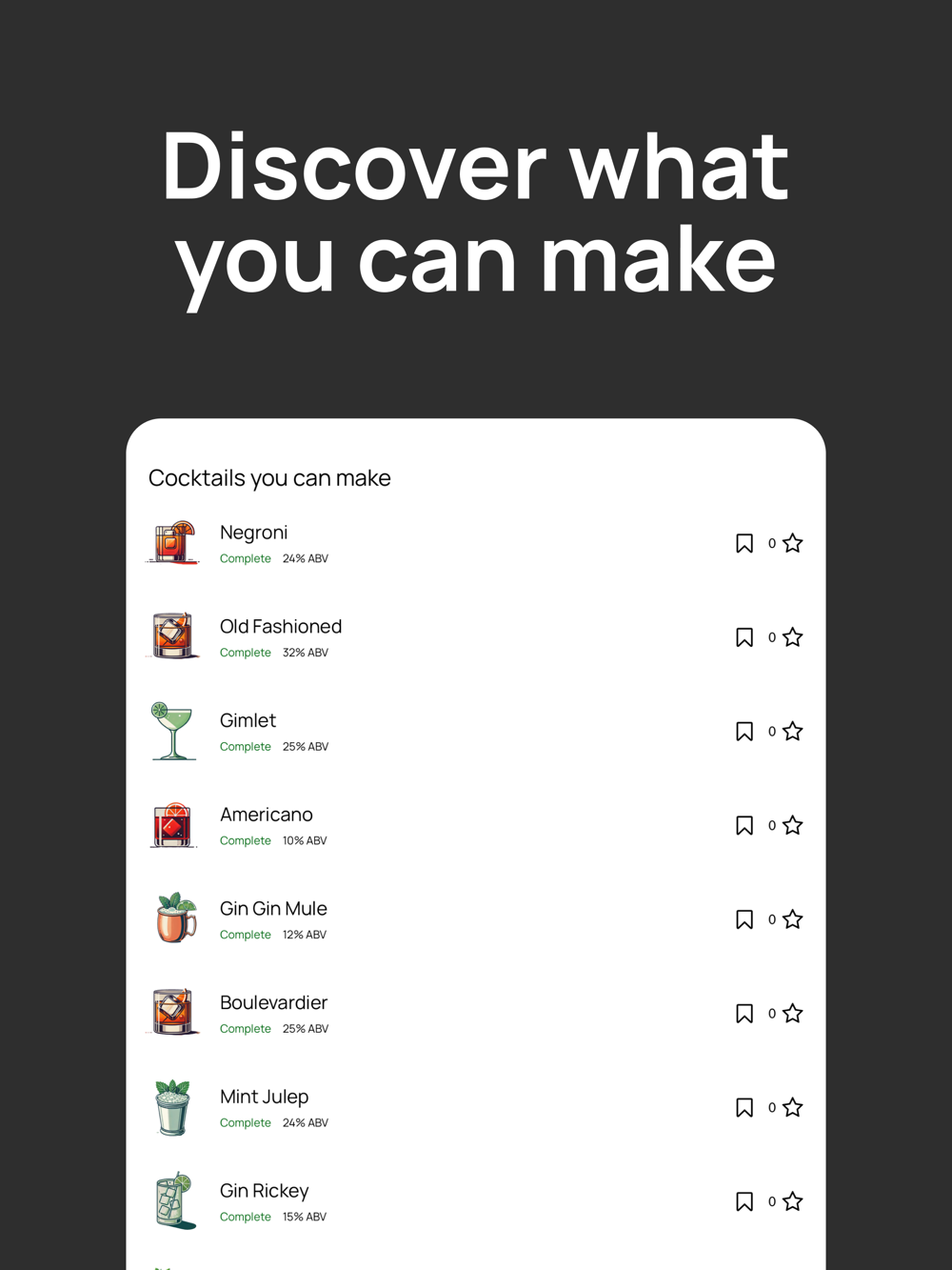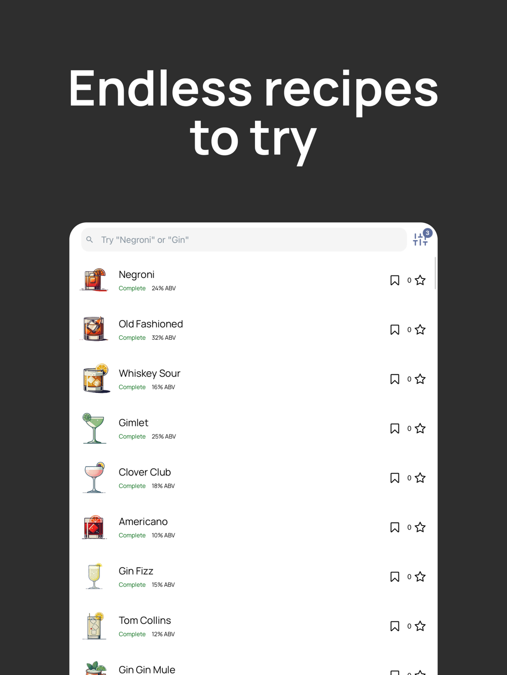 Modify existing recipes or create your own signature drinks. Save your creations for future reference. Sharing custom cocktails is on the way!