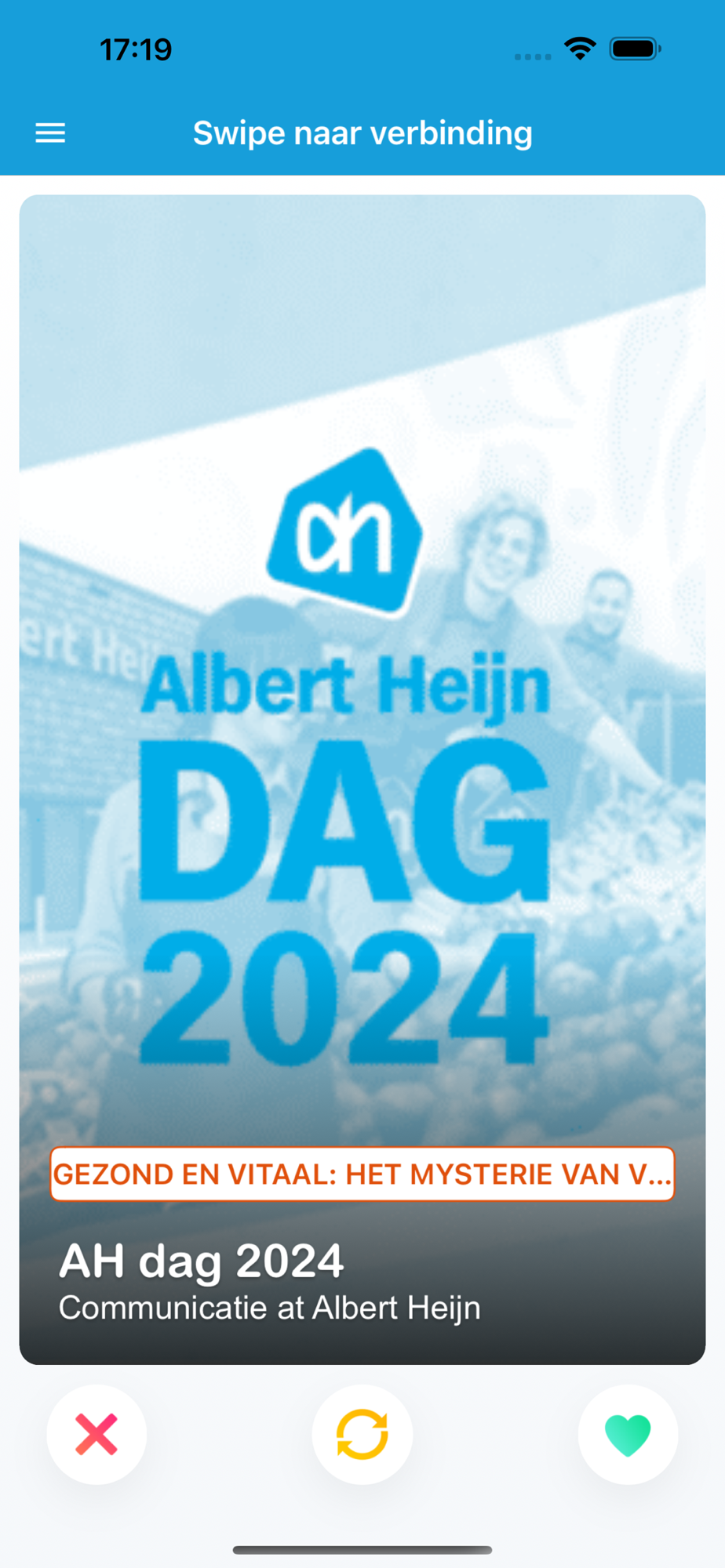 De officiële app van Albert Heijn dag 2024 geeft je naadloze toegang tot Deelnemers, Social feed, Samen rijden, Praktische info, Swipe naar verbinding, Chat, AI ontmaskerd, Scope what?, Digital becomes human, Hoe eet Nederland?, Gezond en vitaal, Socrates op sneakers, Spreken vanuit het hart, Boost je creativiteit en Crash the social party functionaliteit om je gedurende het evenement verbonden en betrokken te houden.