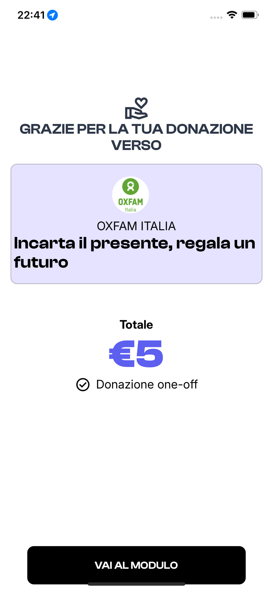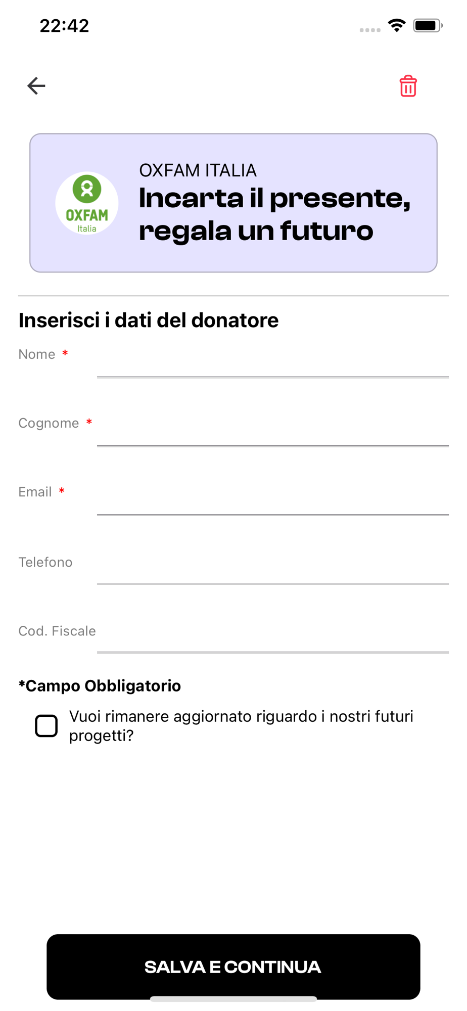 - Donazioni contactless con carta fisica, digital wallet o inserimento IBAN per addebito diretto.