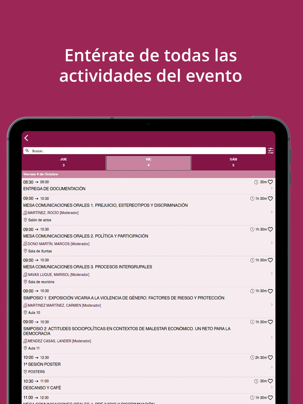 En la aplicación oficial del VI Congreso Internacional de la Sociedad Científica Española de Psicología Social y XVII Congreso Nacional de Psicología Social podrás encontrar toda la información sobre el evento: Sede, agenda, ponentes, contacto con la organización, etc...