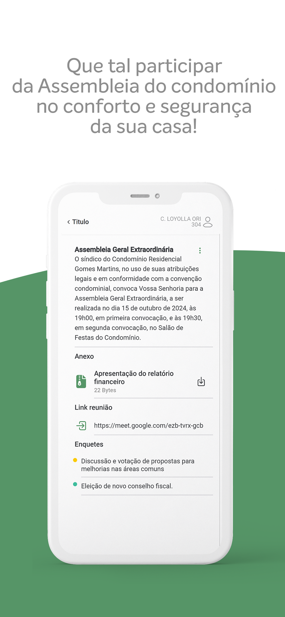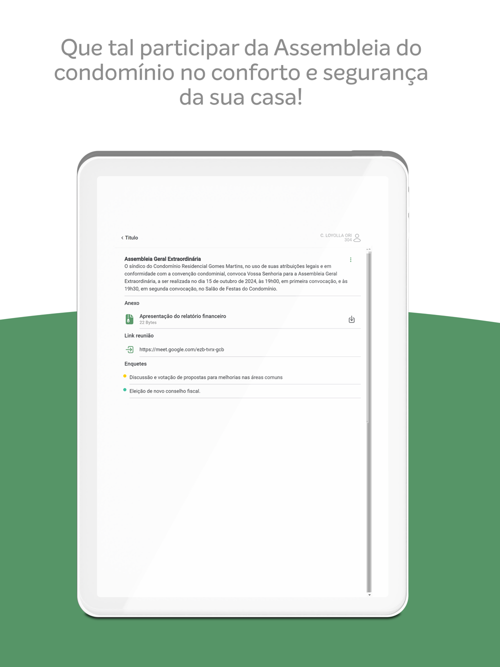 O aplicativo Gomes Martins é um ambiente customizado, o qual facilita a comunicação entre os moradores e o síndico através da reserva de espaços comuns, como academia e salão de festas, das assembleias realizadas virtualmente, além de ser um local onde você pode avisar sobre achados e perdidos, realizar enquetes sobre o condomínio e até liberar seus convidados antecipadamente na portaria, sem precisar atender o interfone.