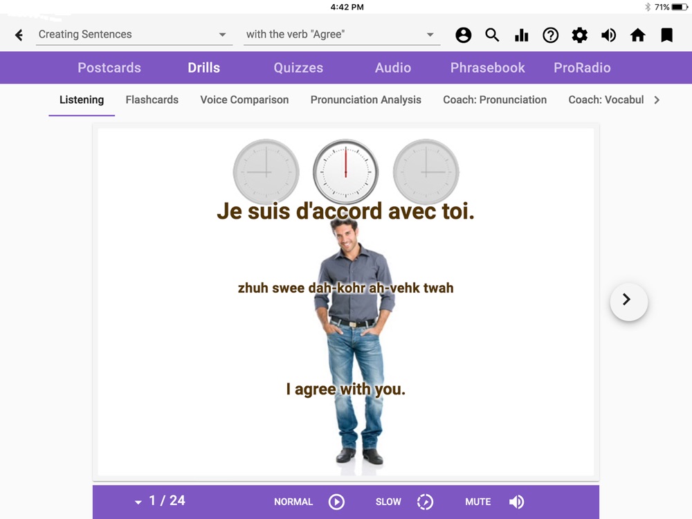 Pronunciator teaches the full range of language skills -- reading, writing, listening, and speaking -- in a structured, building-block approach.