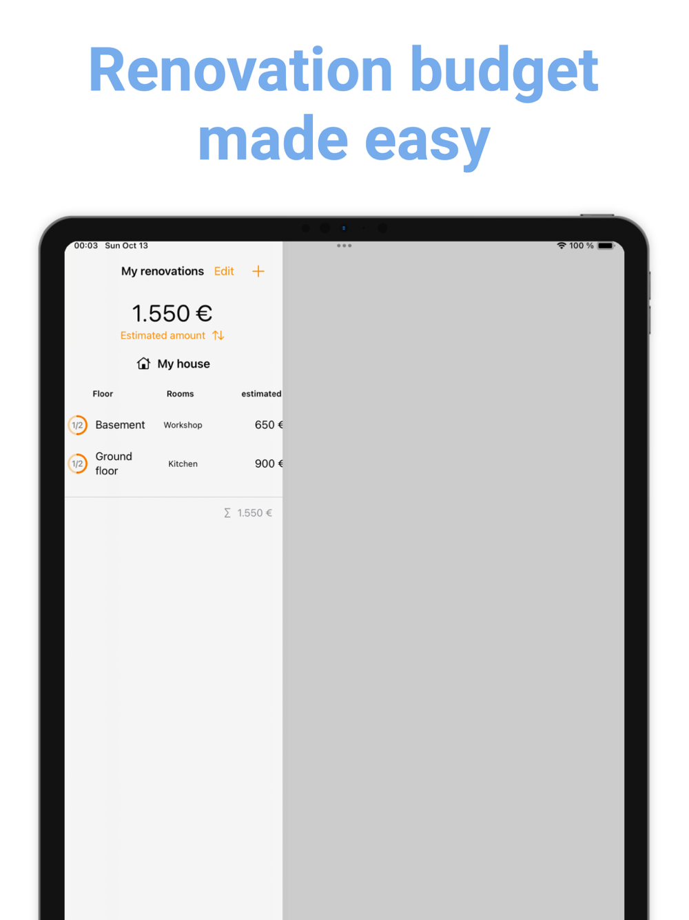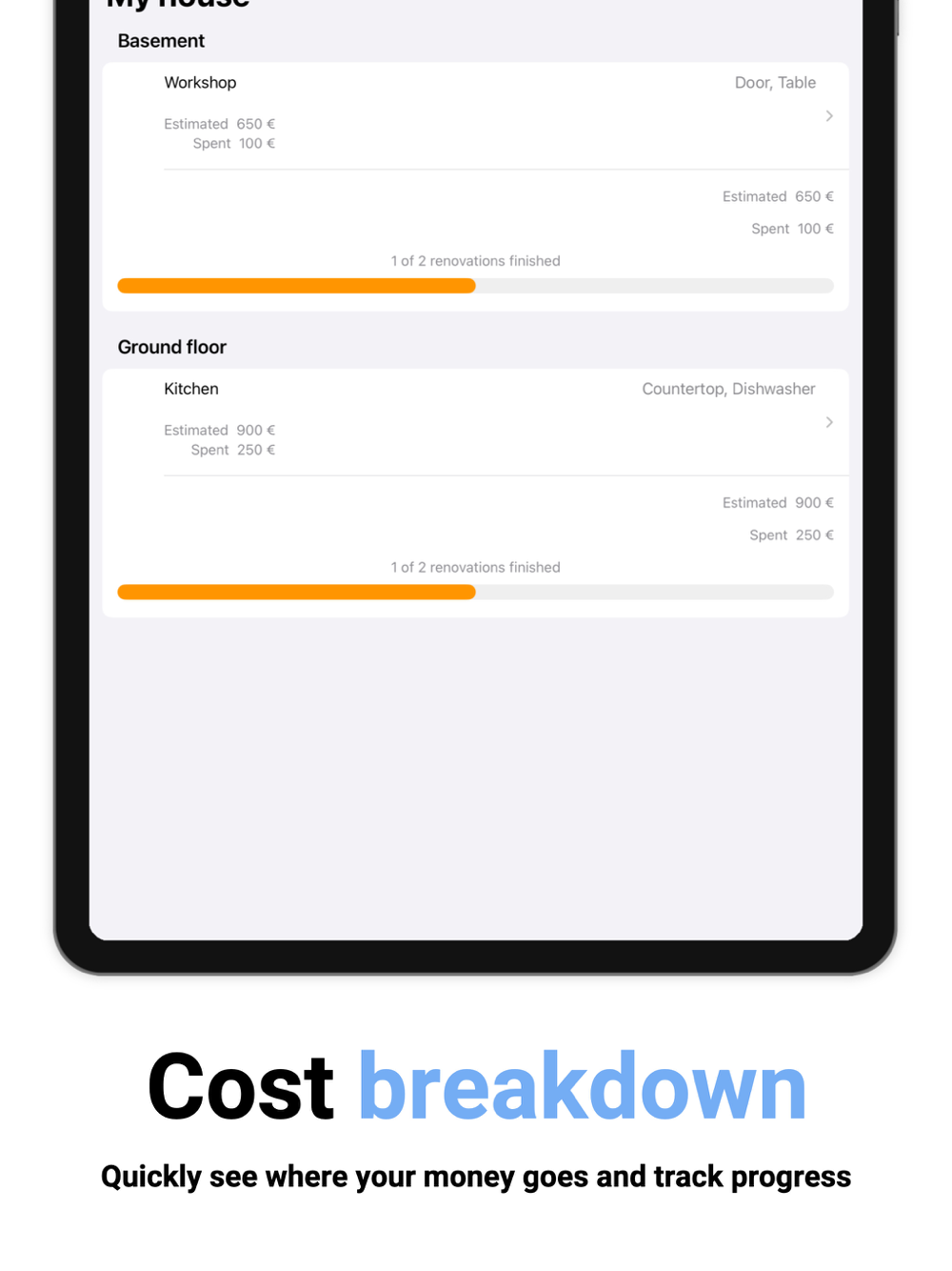Planning a home renovation? Stay on top of your budget with Home Renovation Cost Tracker, the easy-to-use app that helps you calculate and track all your renovation expenses, room by room, floor by floor!