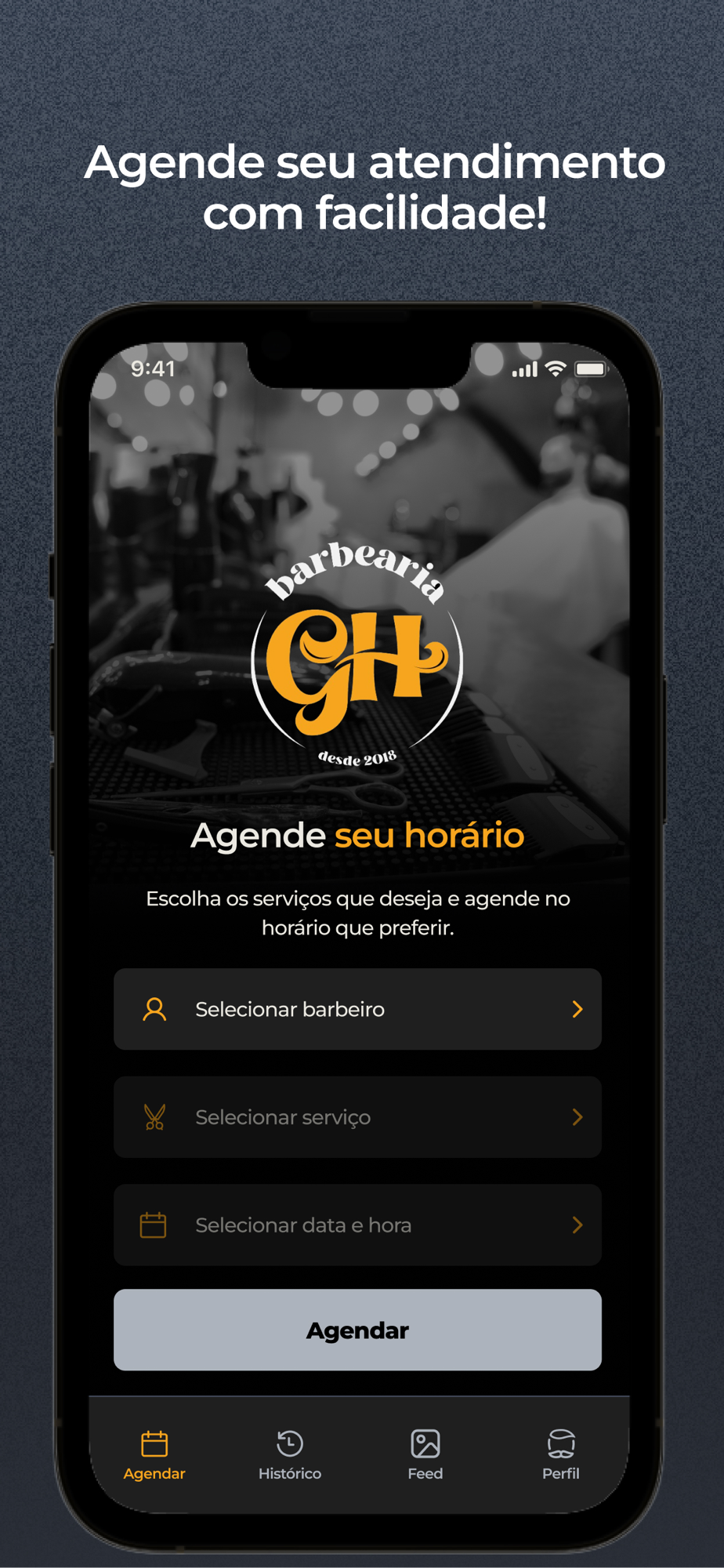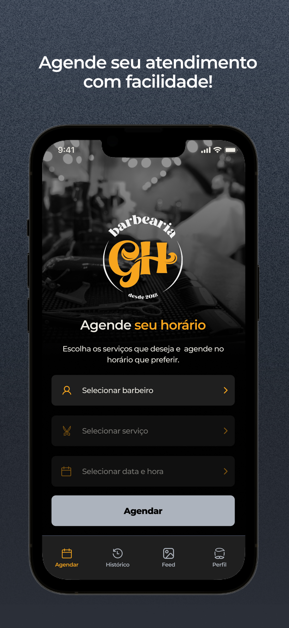 Através do App Barbearia GH os clientes podem realizar seus agendamentos de uma forma muito mais prática. Na tela inicial, é possível selecionar os serviços e horário desejado para seu próximo atendimento. Já na tela de histórico, você poderá avaliar como foi o seu atendimento, remarcar ou cancelar seus agendamentos. É possível também na tela do perfil o cliente editar suas informações, como e-mail, foto de perfil e telefone.