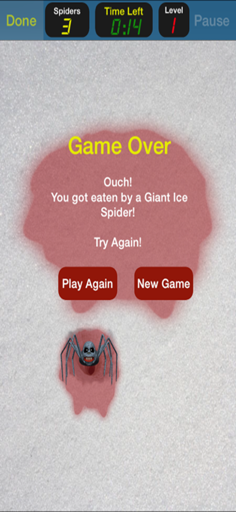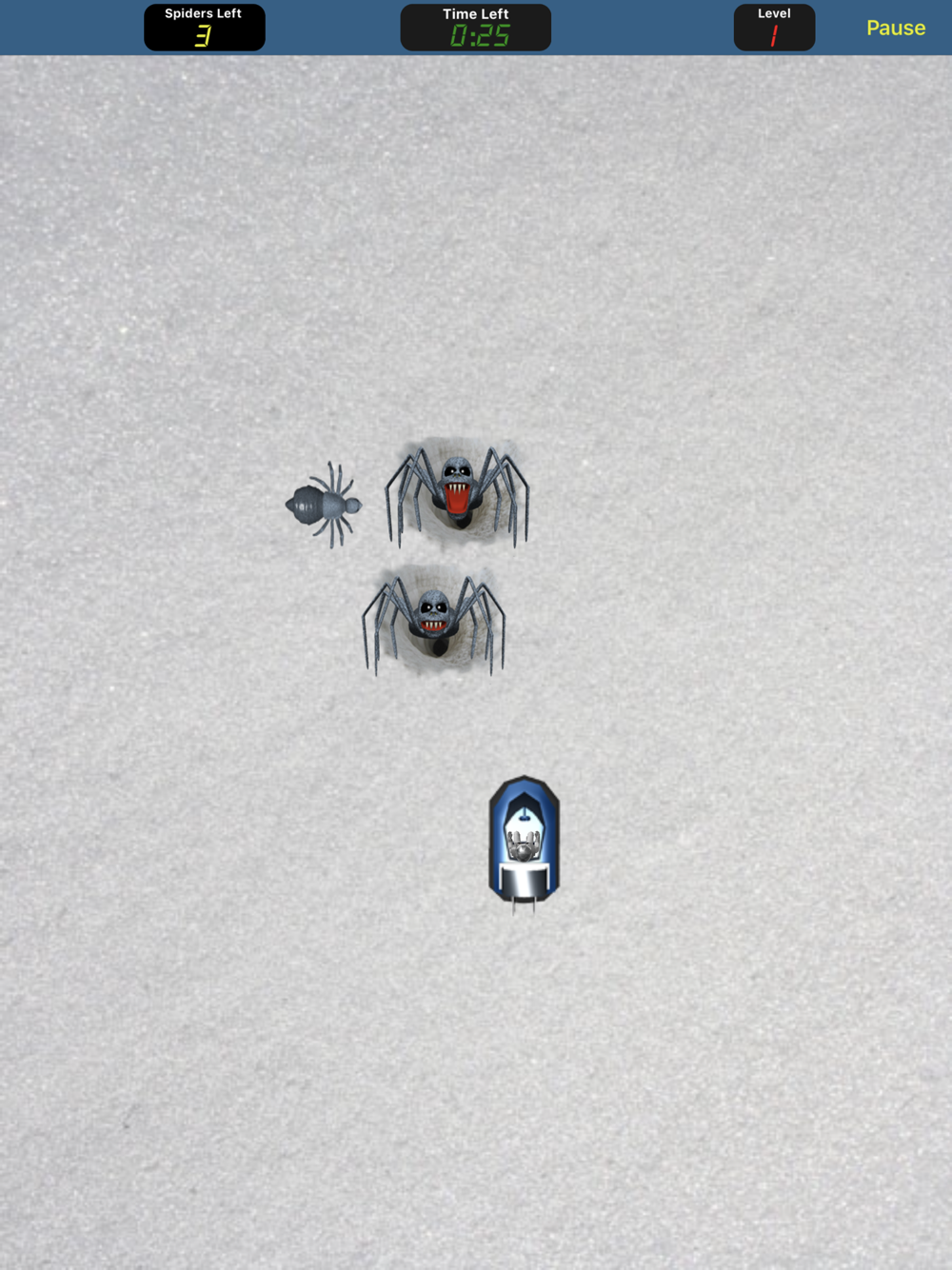Can you escape from the Ice Spiders? You discovered a Top Secret Government lab in the Arctic where they created Giant Ice Spiders. Now you have to escape using your hovercraft before the spiders get you!