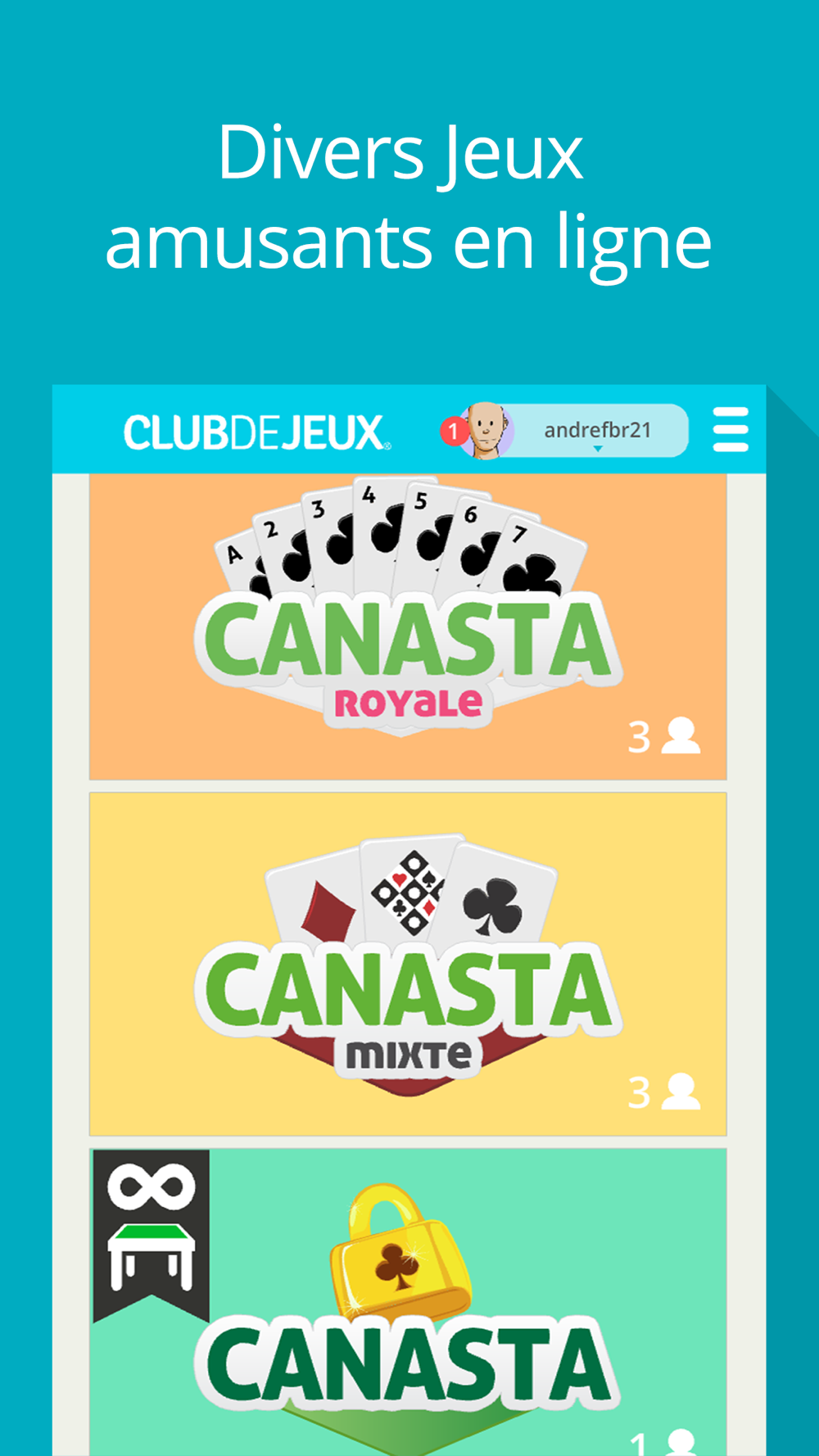 Jouez à la Canasta, à la Canasta Royale, à la Canasta Mixte, aux Échecs ou aux Dominos directement depuis votre ordinateur, votre smartphone ou votre tablette. Choisissez entre les 5 jeux en ligne et jouez avec d’autres personnes ou contre les robots. Divertissez-vous dans les salons libres et de compétitions ou démontrez votre compétence dans les Tournois. Notre application 5-en-1 se connecte automatiquement au serveur multiplate-forme de ClubDeJeux pour vous mesurer à d'autres joueurs présents sur d’autres plate-formes.