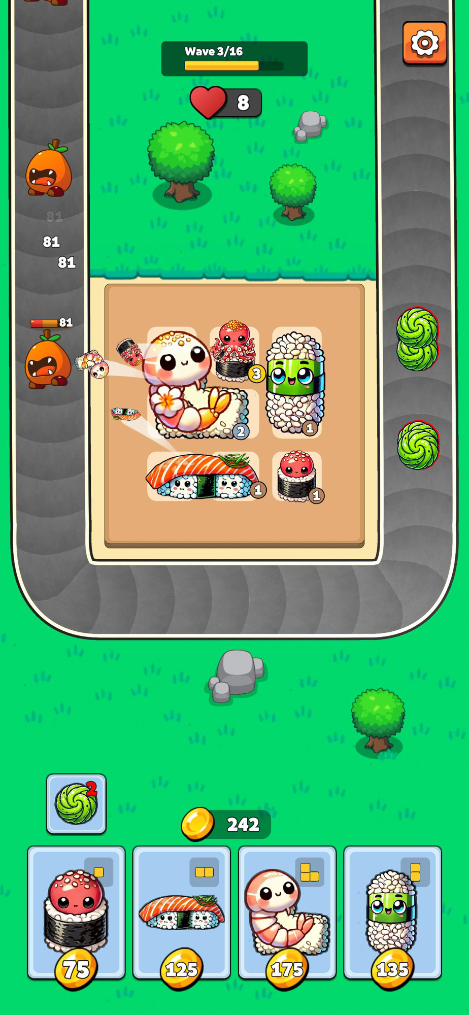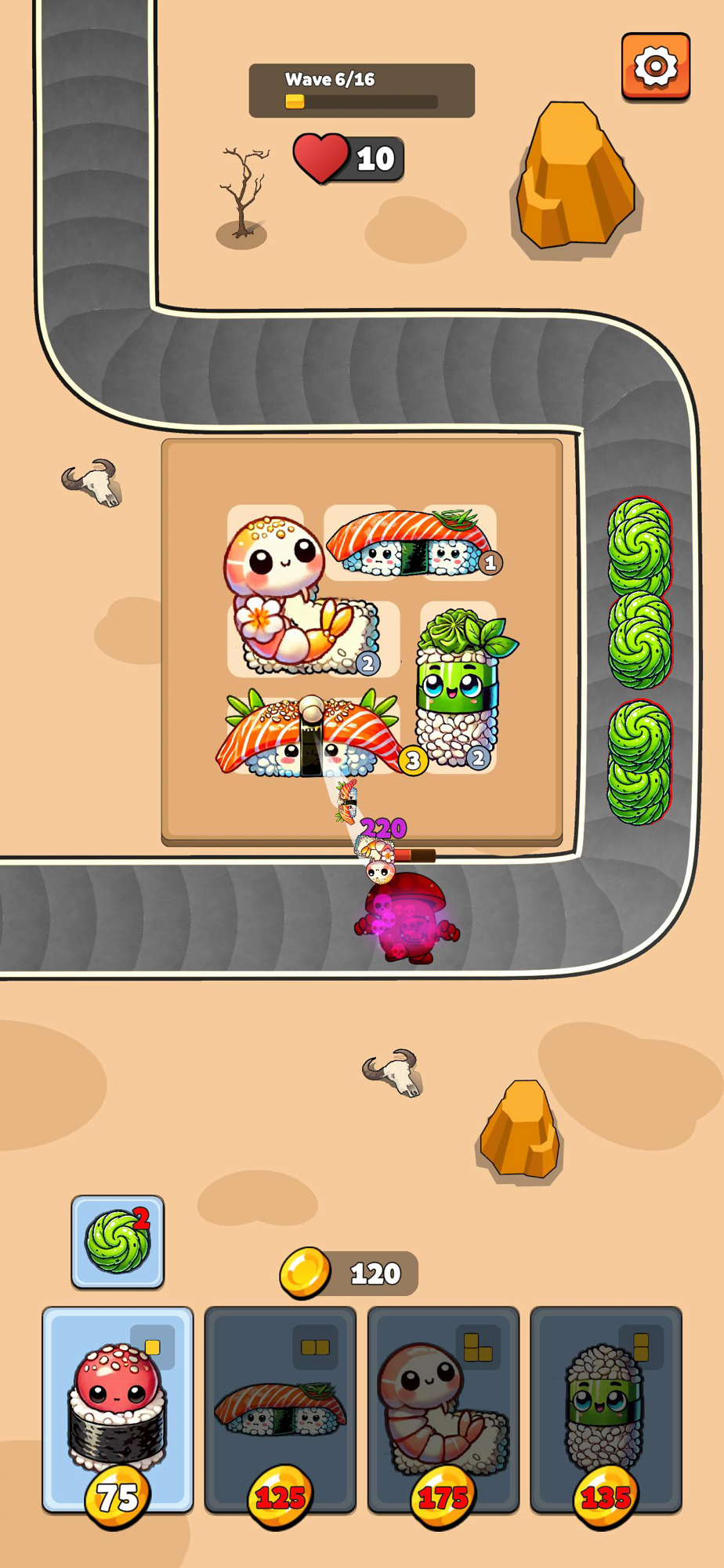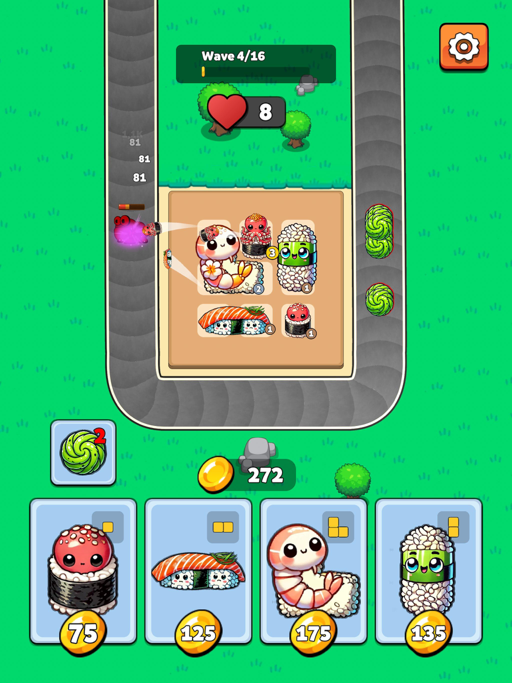Refine your strategies by optimizing sushi placement and leveraging the synergies between their abilities to strengthen your defenses. Fend off increasingly formidable waves of monsters and protect the conveyor belt until the last bite! Collect explosive wasabi balls to help you fend off the waves of enemies!