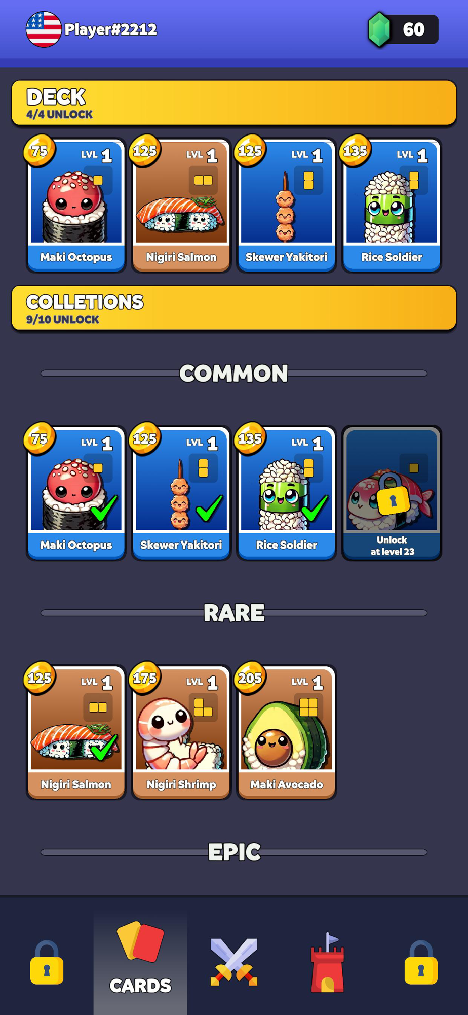 Each sushi has its own unique size and shape: some occupy a single tile, while others cover 2x1, 2x2, or L-shaped areas. Choose from a tempting variety of sushi with unique powers: poison enemies, explode on impact, generate gold coins, or boost neighboring sushi.