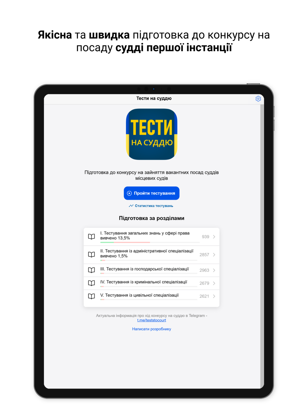 Мобільний додаток "Тести на суддю" розроблено з метою надання можливості швидкої та зручної підготовки зацікавлених осіб для проходження конкурсу (добору) на посаду судді