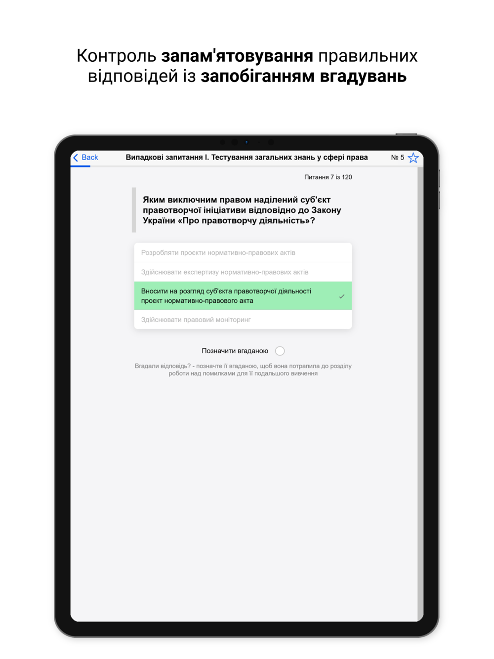 Проходити тести та вивчати питання можна повністю, частинами по групам запитань, частинами з випадкових запитань, у формі роботи над помилками по питанням, в яких було допущено помилку, а також шляхом повторення вивчених питань. Варіанти відповідей тасуються при кожному проходженні тестування для забезпечення високої ефективності запам'ятовування відповідей і запобігання вгадування