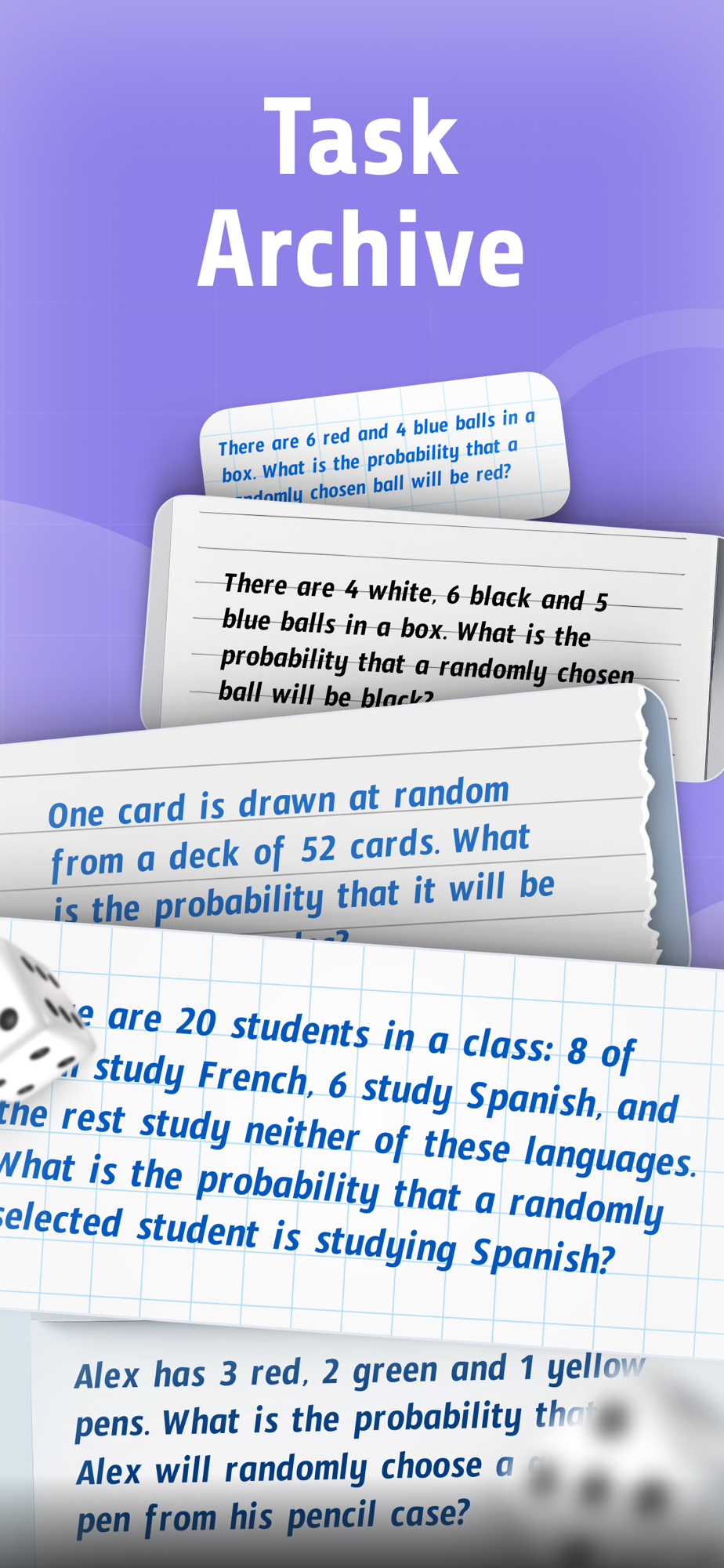 "Probability Solver" is an intuitive app designed to help you calculate probabilities effortlessly. Simply take a picture of a problem, and the app will provide a detailed solution step-by-step. Ideal for students and professionals, it supports real-time problem-solving with clear explanations and quick results. Manage previous tasks with the archive feature.
