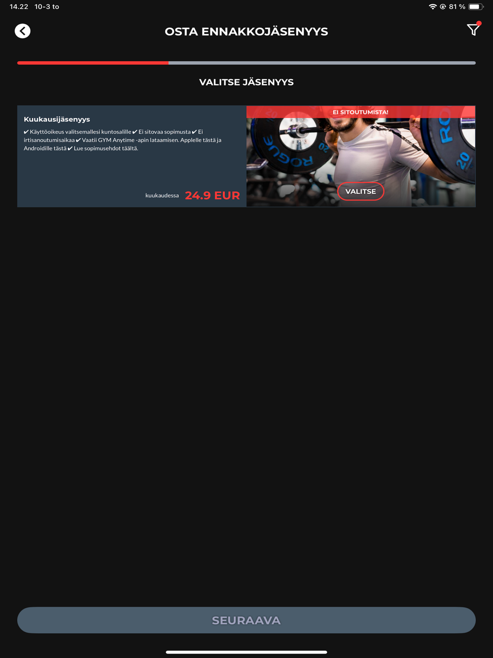 Olitpa sitten jo GYM Anytime -jäsen tai vasta sellaiseksi haluava, mobiilisovelluksemme on käyttöliittymäsi palveluihimme. Sen avulla voit aloittaa kuntoilun meillä, käyttää mobiilisalikorttiasi ja paljon muuta!