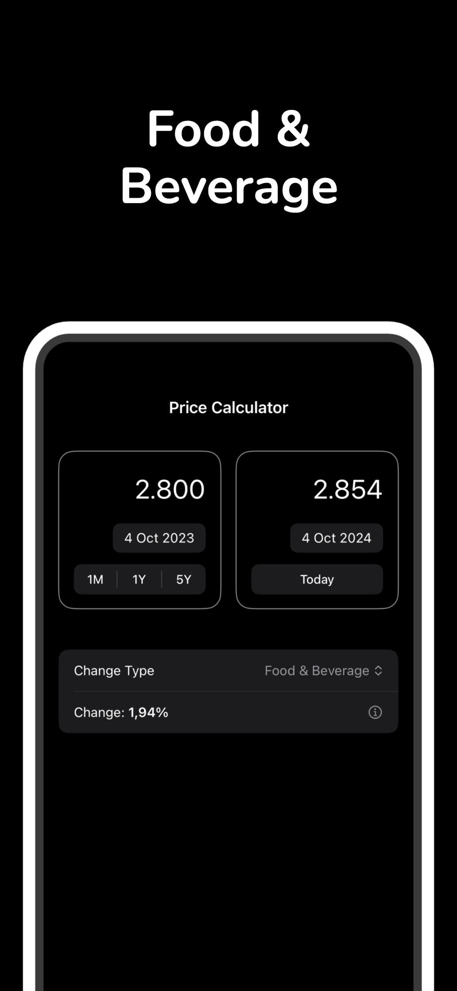 PriCal helps you to calculate price changes in 8 different inflation types: All Items, Food & Beverage, House, Apparel, Transportation, Medical, Recreation and Education & Communication.