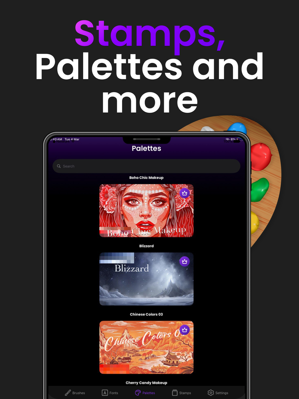 • Color Palettes – Choose from vibrant palettes or create your own for perfect color harmony.