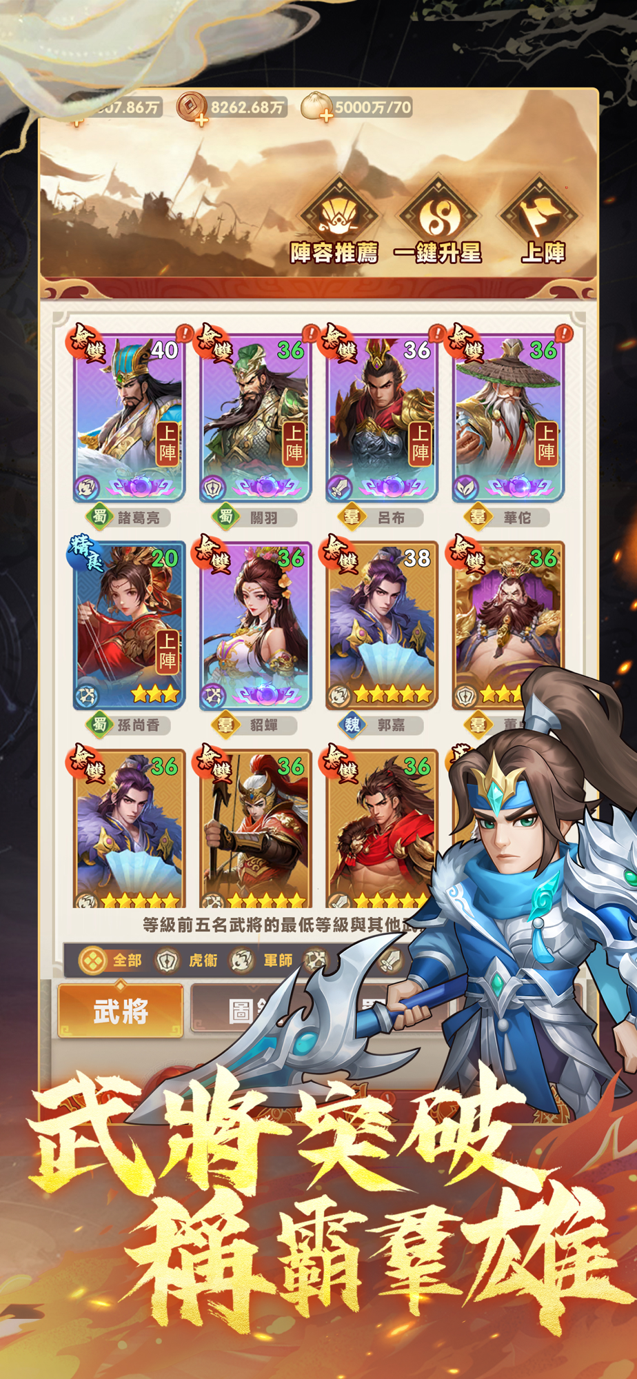 遊戲全武將優質動態美術立繪+全語音,從五子良將,到十八路諸侯,細膩的筆觸勾勒歷史群星閃耀的三國時代,帶你走近三國武將的內心,每一位武將技能玩法有趣,隨意組合戰鬥,精心打磨不敗軍團。