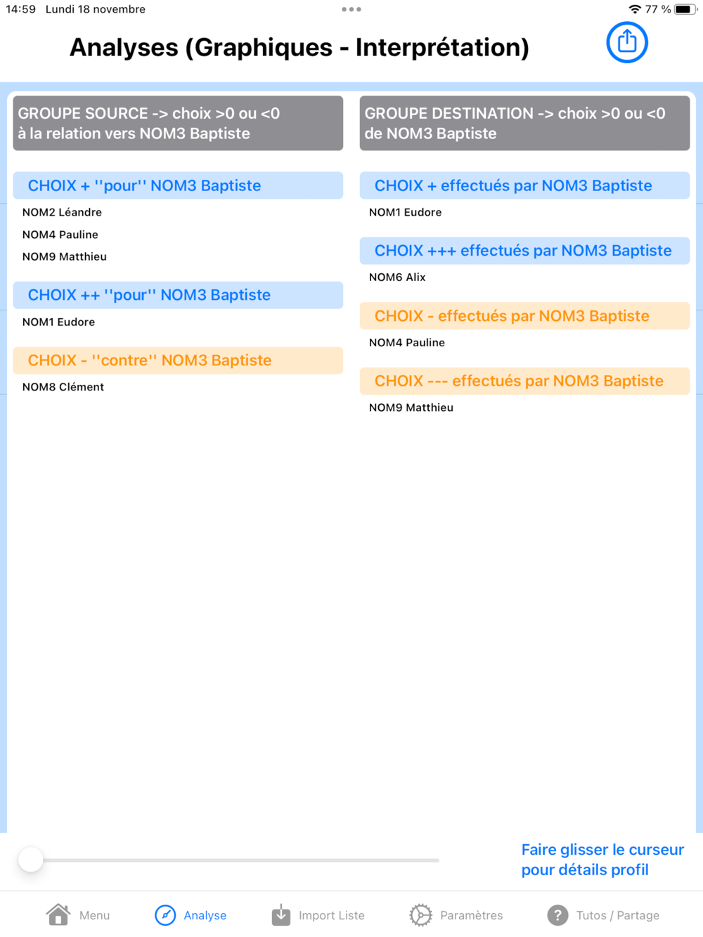 Cet outil, qui a été construit à partir des travaux de J. L. Moreno et de l’expérience de professeur principal depuis de nombreuses années du concepteur de cette application, prend la forme d’un sociogramme.